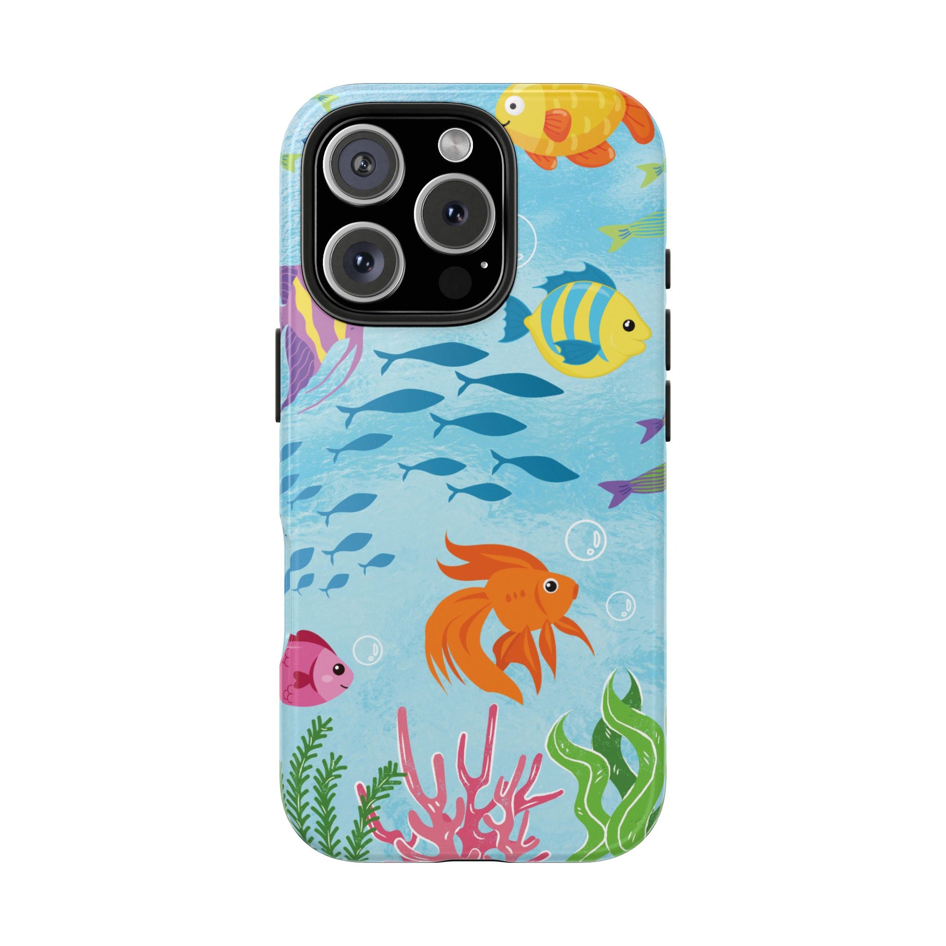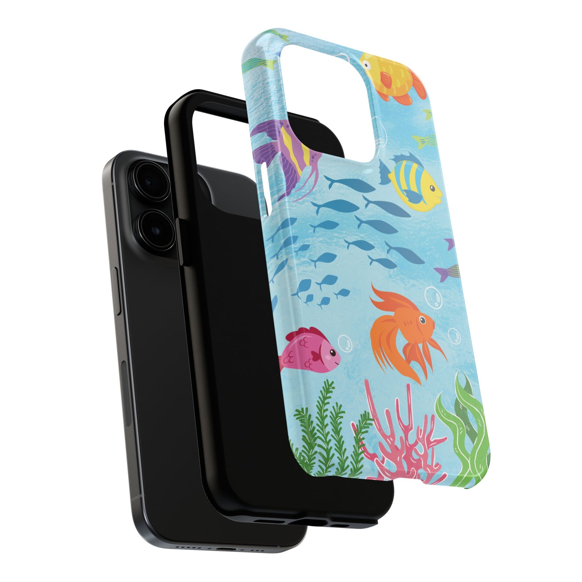 Hand-designed Ocean fish iPhone case with vibrant underwater sea life. Bring the beauty of the ocean everywhere you go, featuring a vibrant underwater scene filled with colorful cartoon fish, playful bubbles, coral reefs, and seaweed. Perfect for ocean lovers and beach vibes!