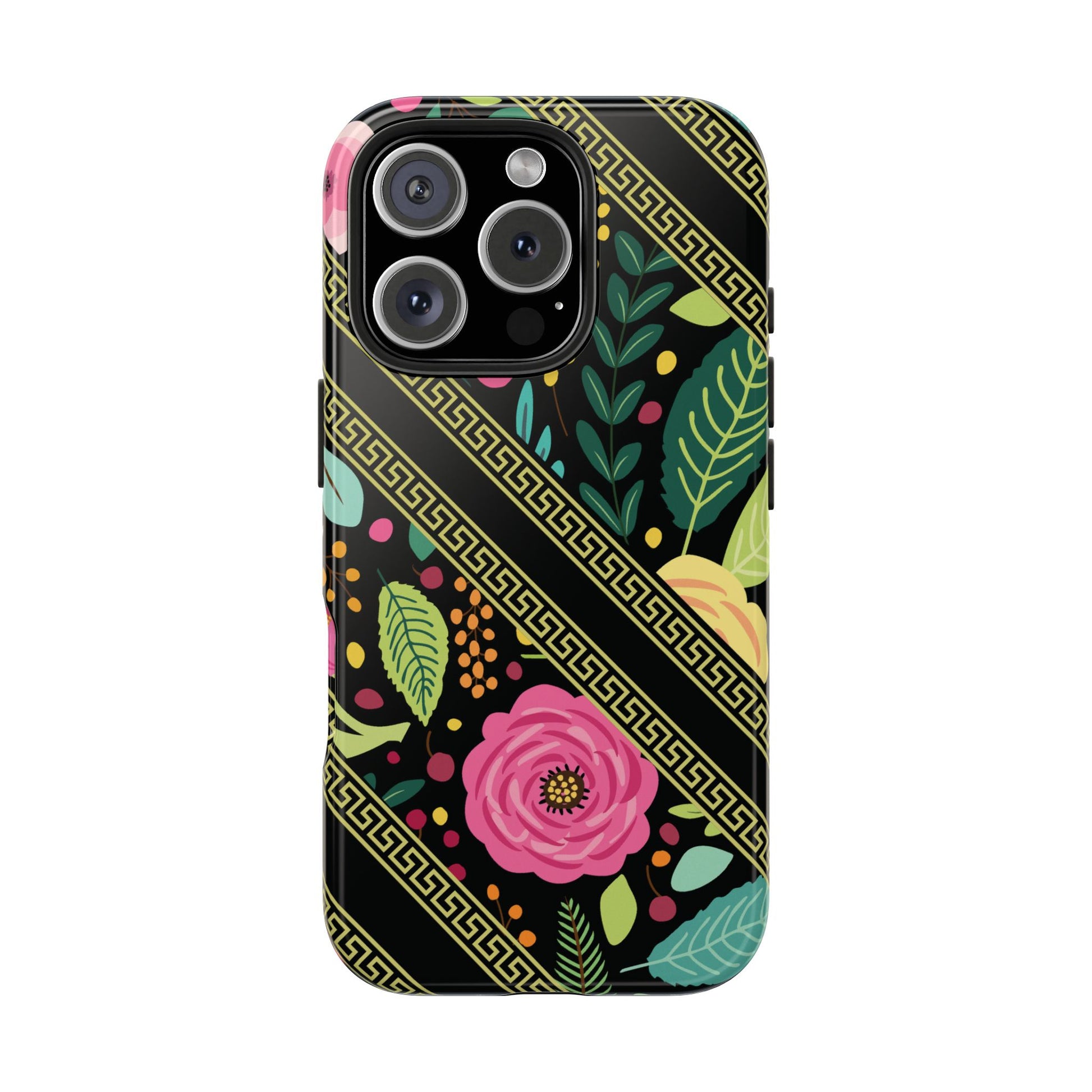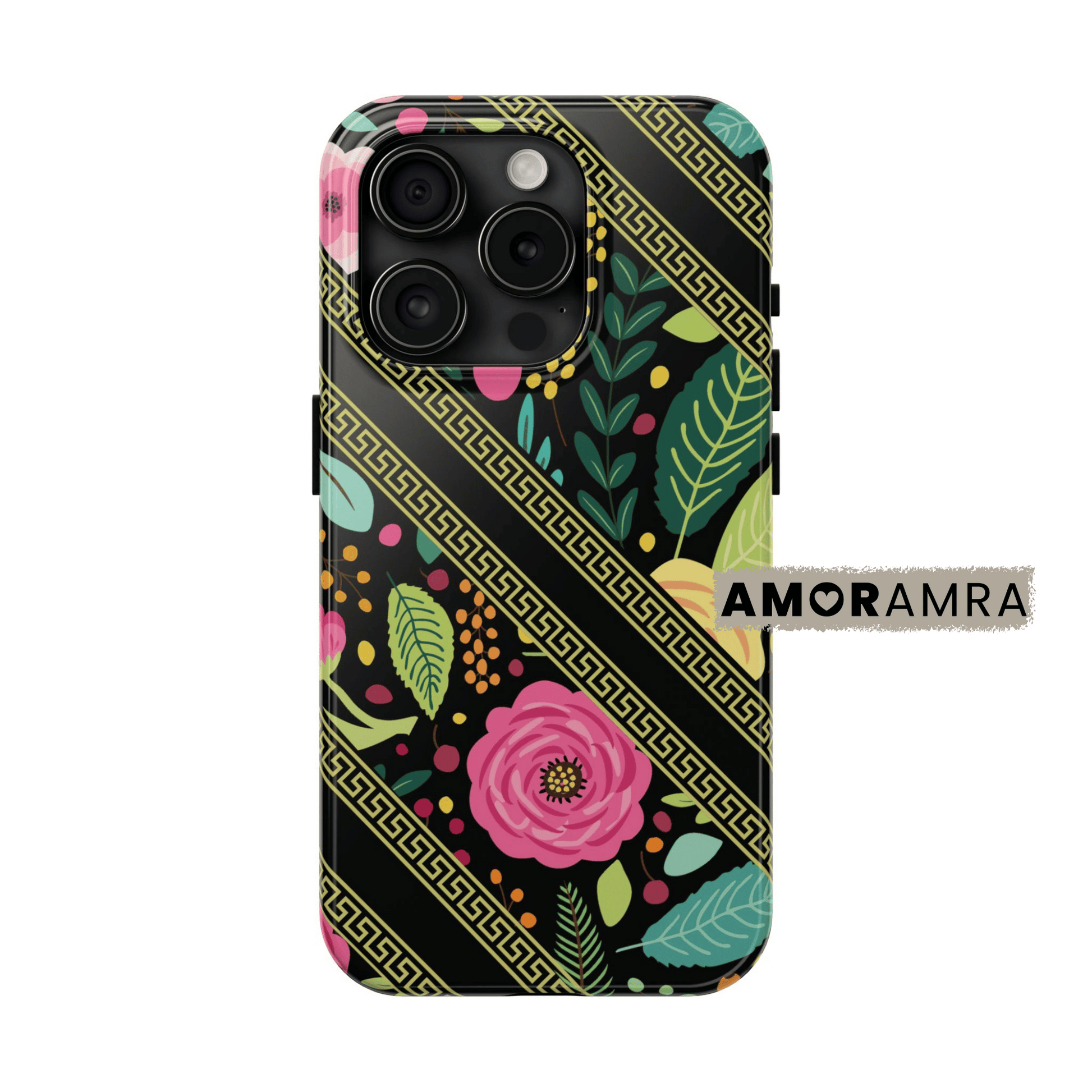 Make a statement with this luxurious floral iPhone case, designed with bold, vibrant flower patterns and elegant gold geometric accents on a sleek black background. This fashion-forward phone cover blends chic botanical art with a touch of classic luxury, creating the perfect balance between charm and sophisticated style.