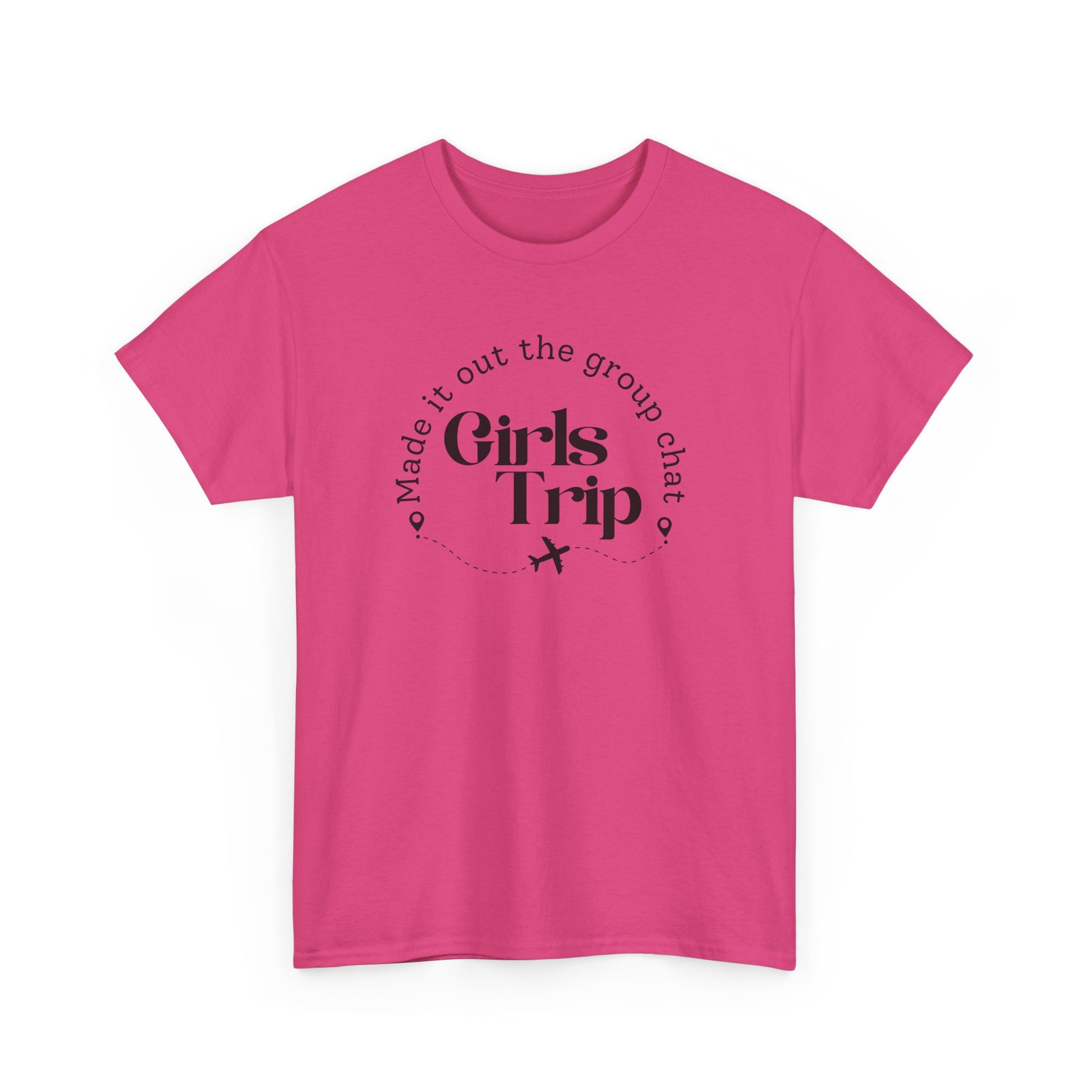 The 'Girls Trip Made It Out the Group Chat' t-shirt is perfect for you and your best friends as you head out on your next girl's getaway. It is the ultimate vacation shirt for group chats that turn into unforgettable travel adventures. Whether you're celebrating a girl's weekend, bachelorette party, or just a spontaneous travel trip with your BFFs, this Made It Out the Group Chat tee is a must-have for every travel-loving group of friends. It is perfect for wearing during long flights, airport hangouts, or on your favorite vacation destination.