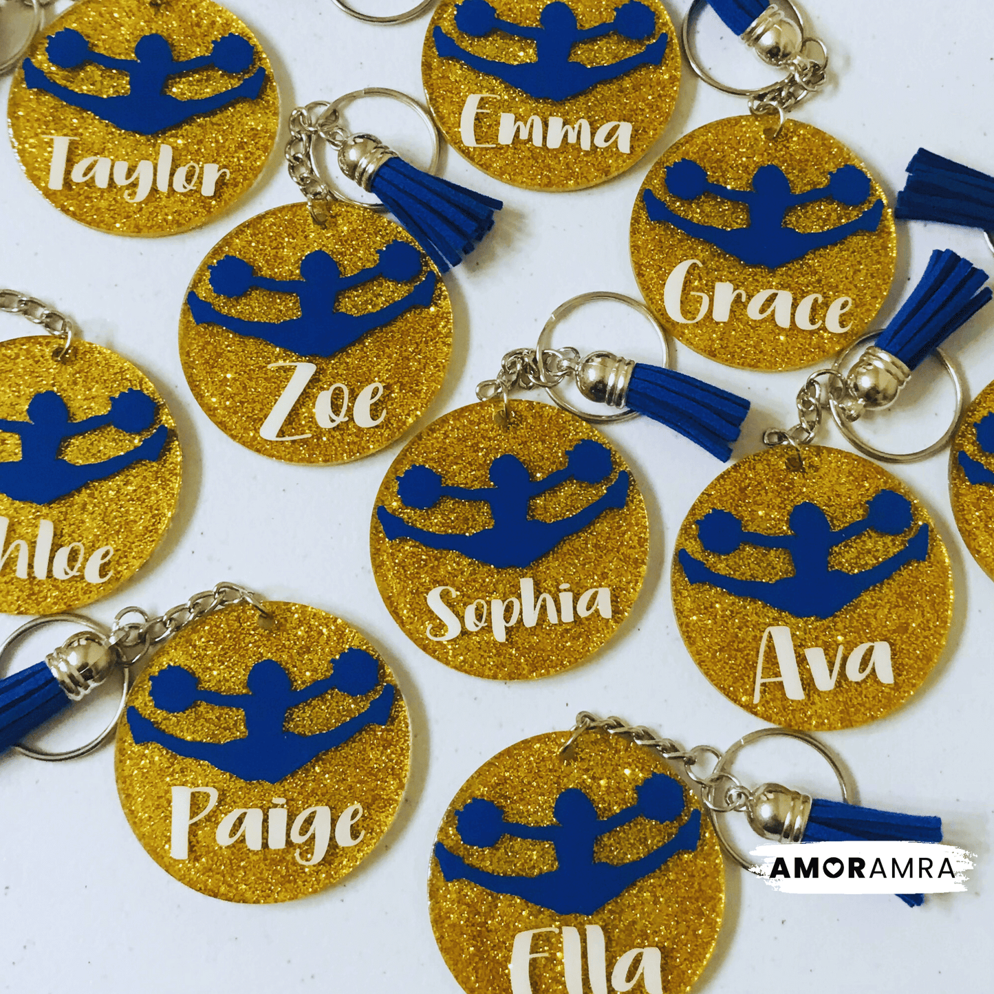 A handmade personalized glitter Cheerleader keychain just for you. Perfect for cheer gift bags, cheer moms, dance teams, backpacks, etc.