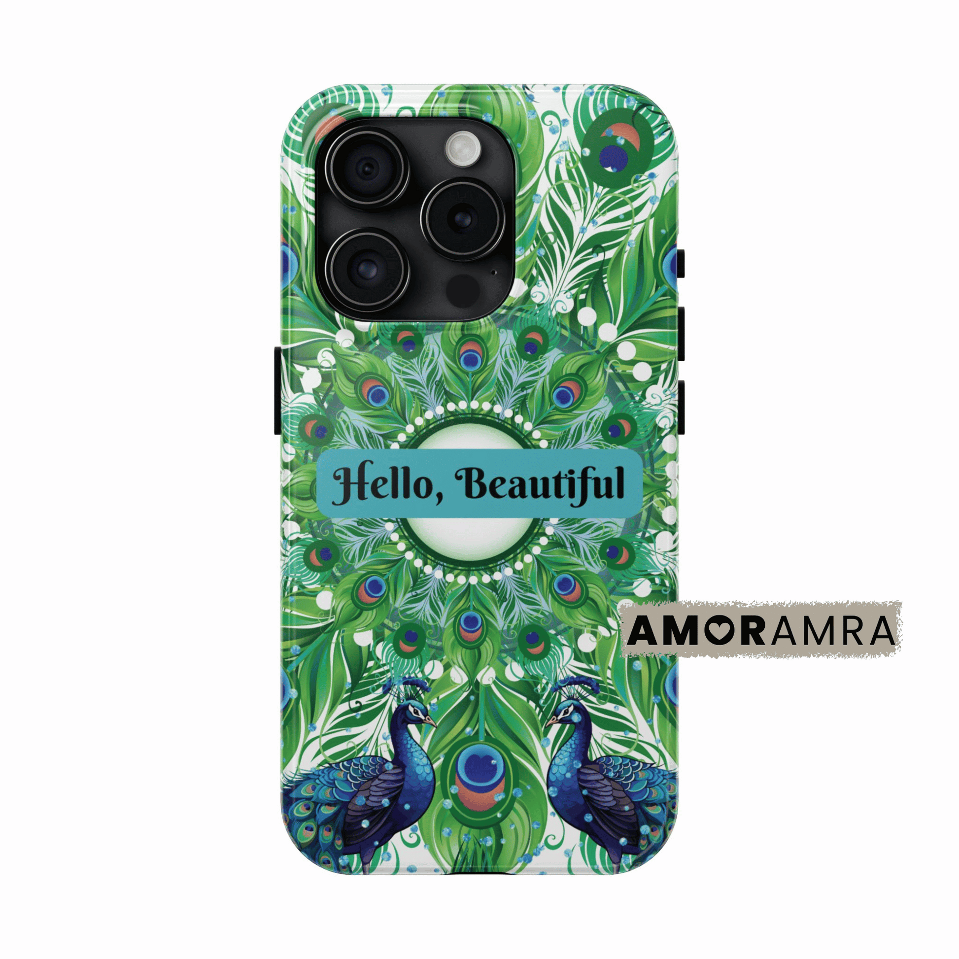 Make every glance at your phone a confidence boost with this hand-designed iPhone case featuring bold peacocks and peacock feathers. The uplifting message “Hello, Beautiful.” is perfect for daily inspiration or anyone needing a little encouragement.