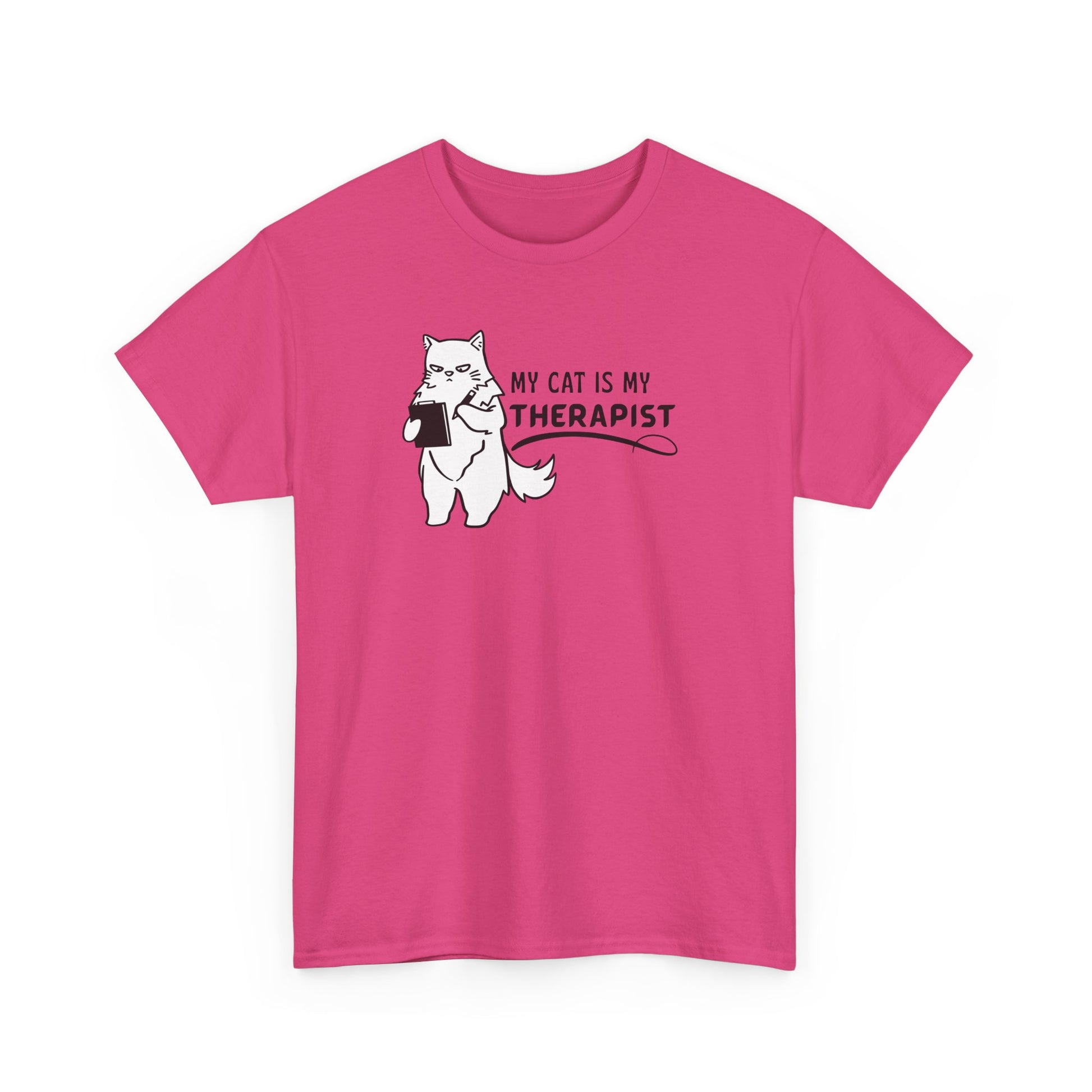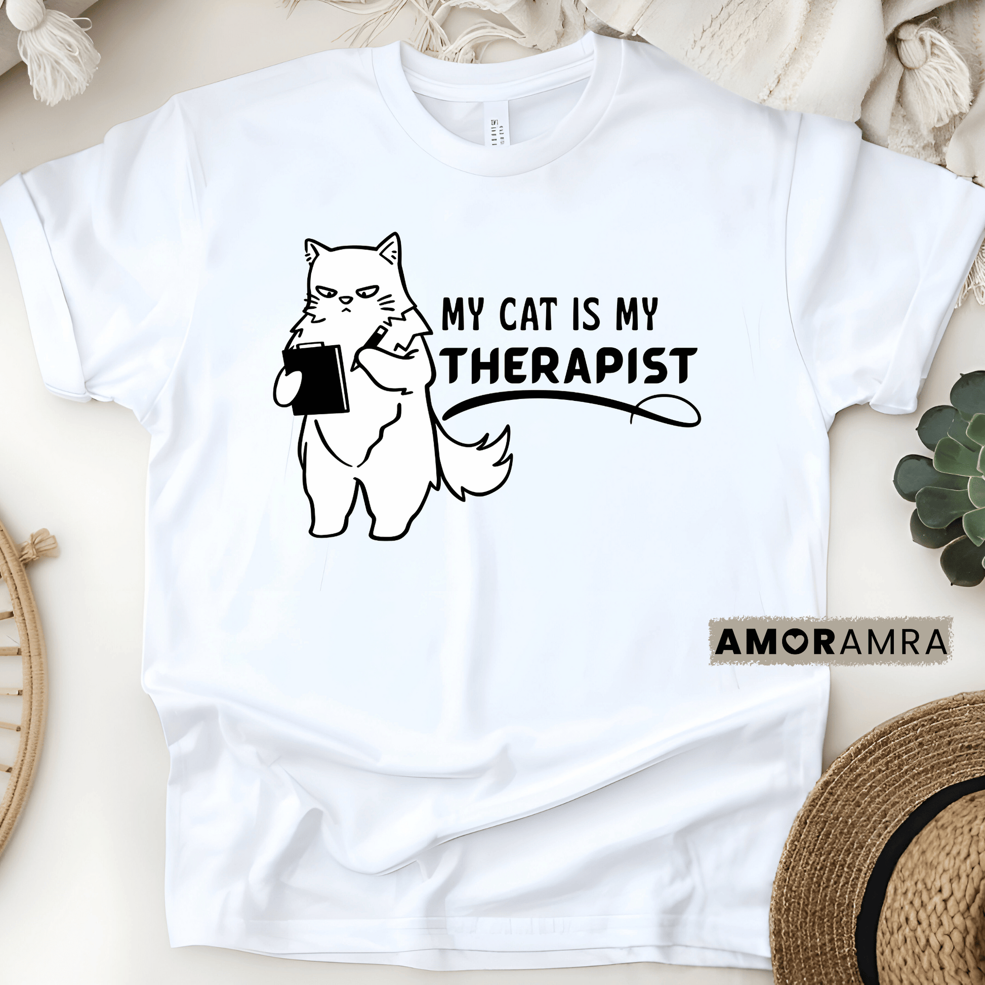 The 'My cat is my therapist' t-shirt is perfect for cat moms, cat dads, pet lovers, and mental health advocates. Whether your kitty provides emotional support, stress relief, or just the best cuddles, this cute and relatable cat shirt is a must-have for anyone who adores their furry friend.
