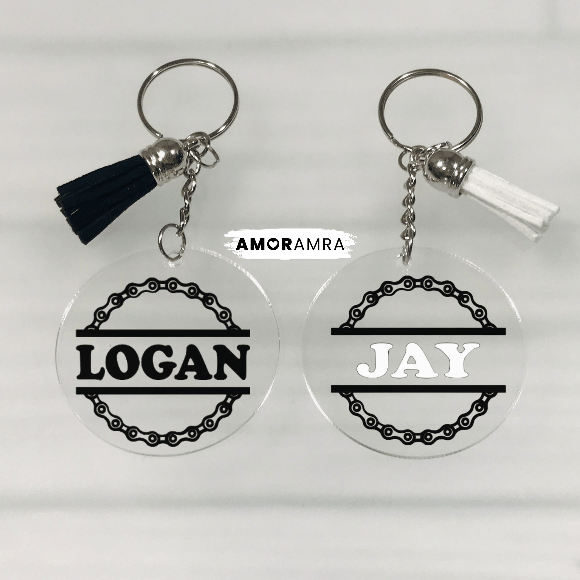 Each keychain comes with a silver ring and leather tassel; sizes include 2" or 2.5".