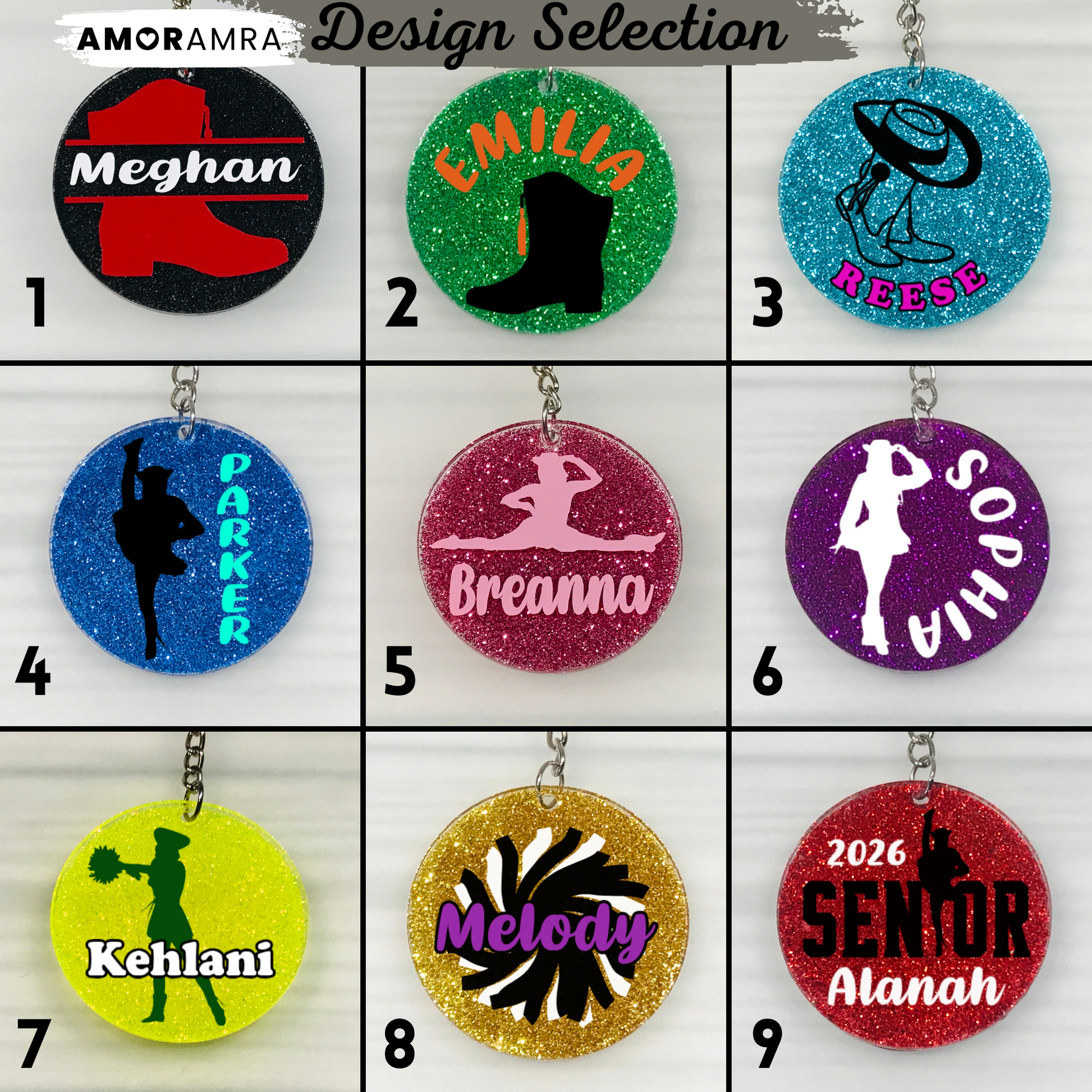 A handmade personalized glitter Drill team keychain just for you. Perfect for gift bags, dance moms, dance teams, backpacks, etc.