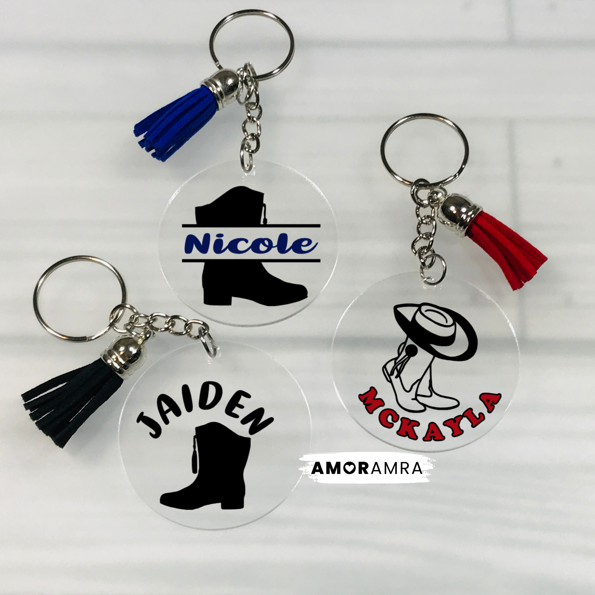 Each keychain comes with a silver ring and leather tassel; sizes include 2" or 2.5".