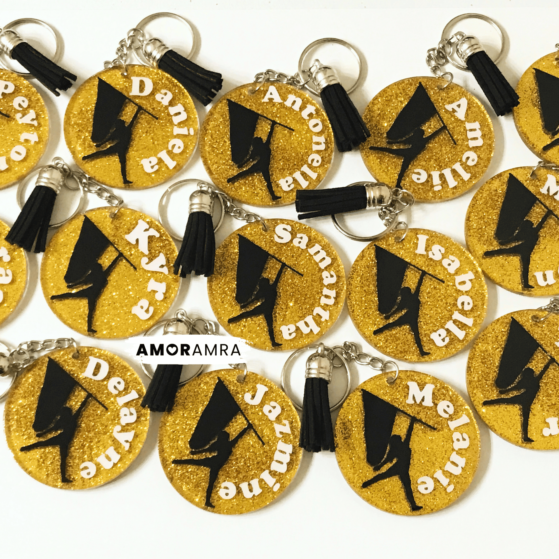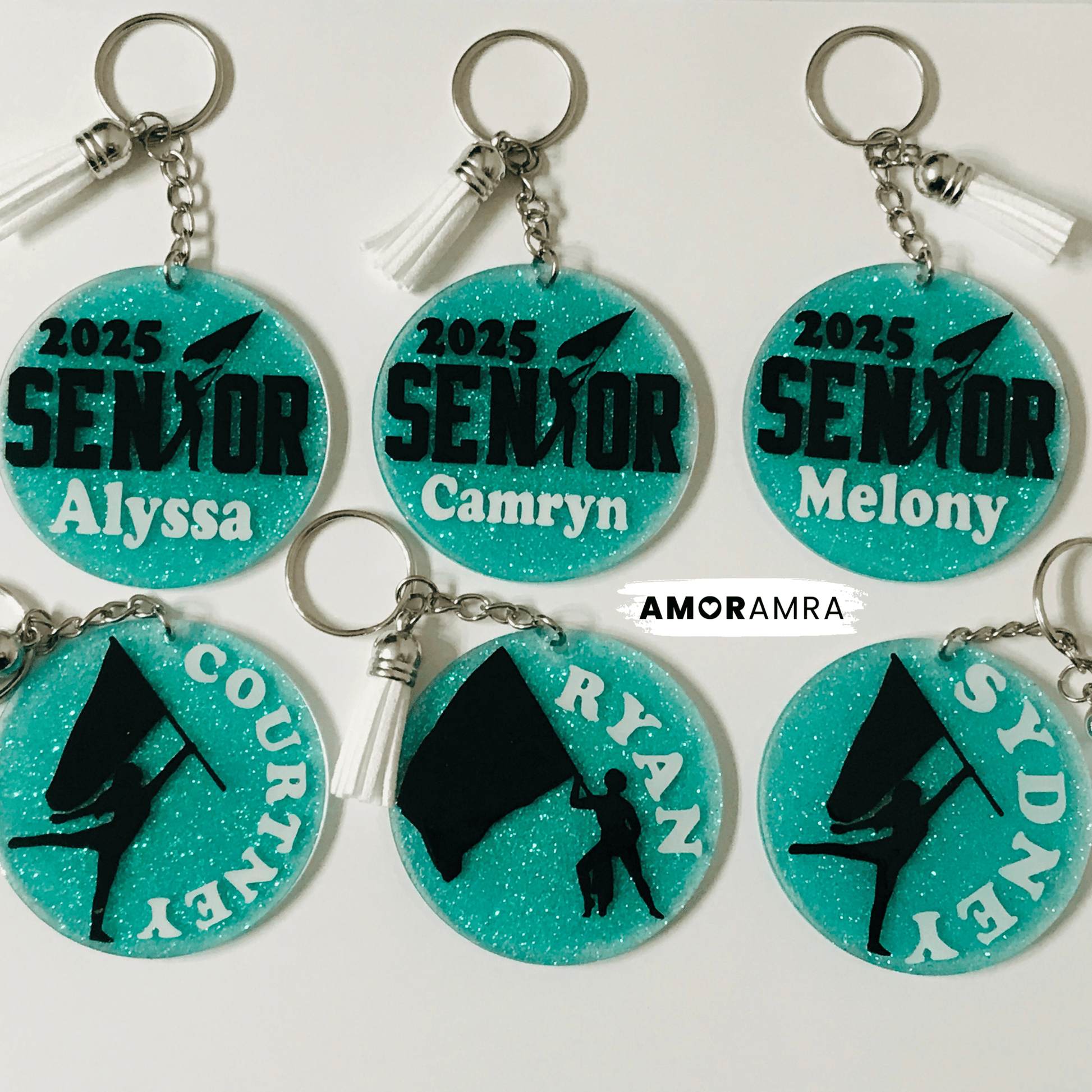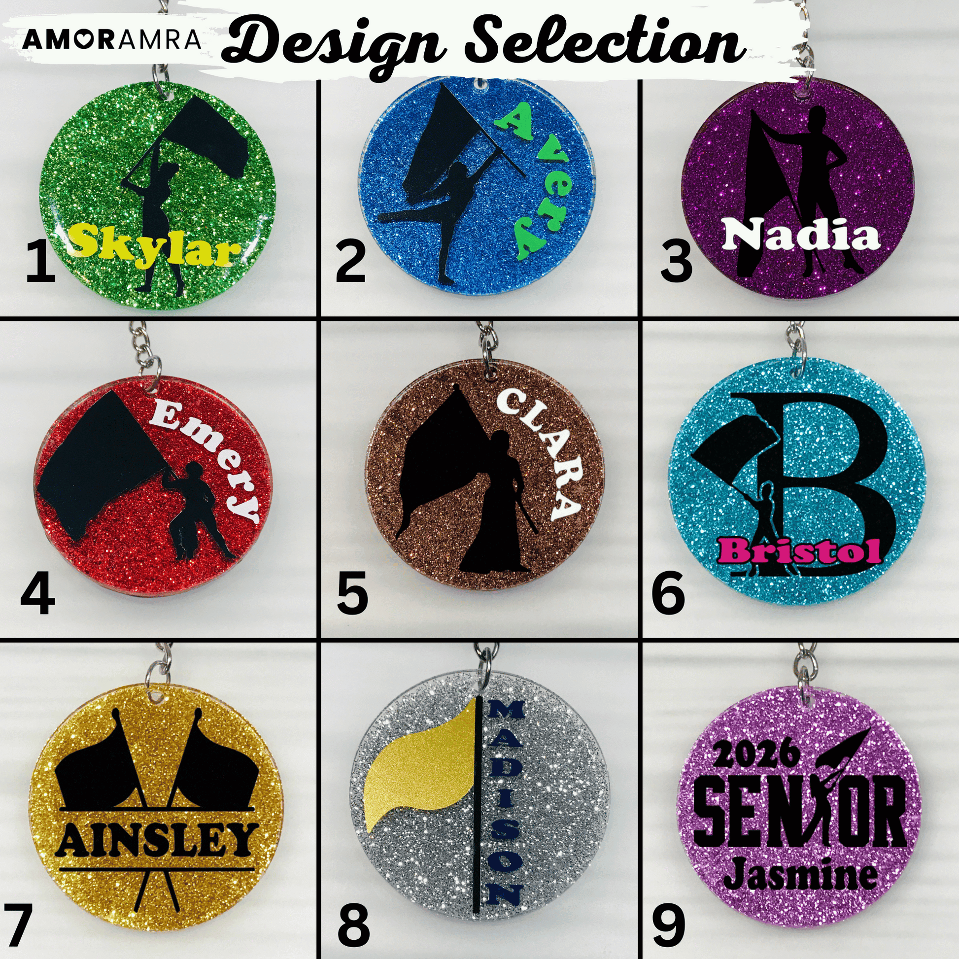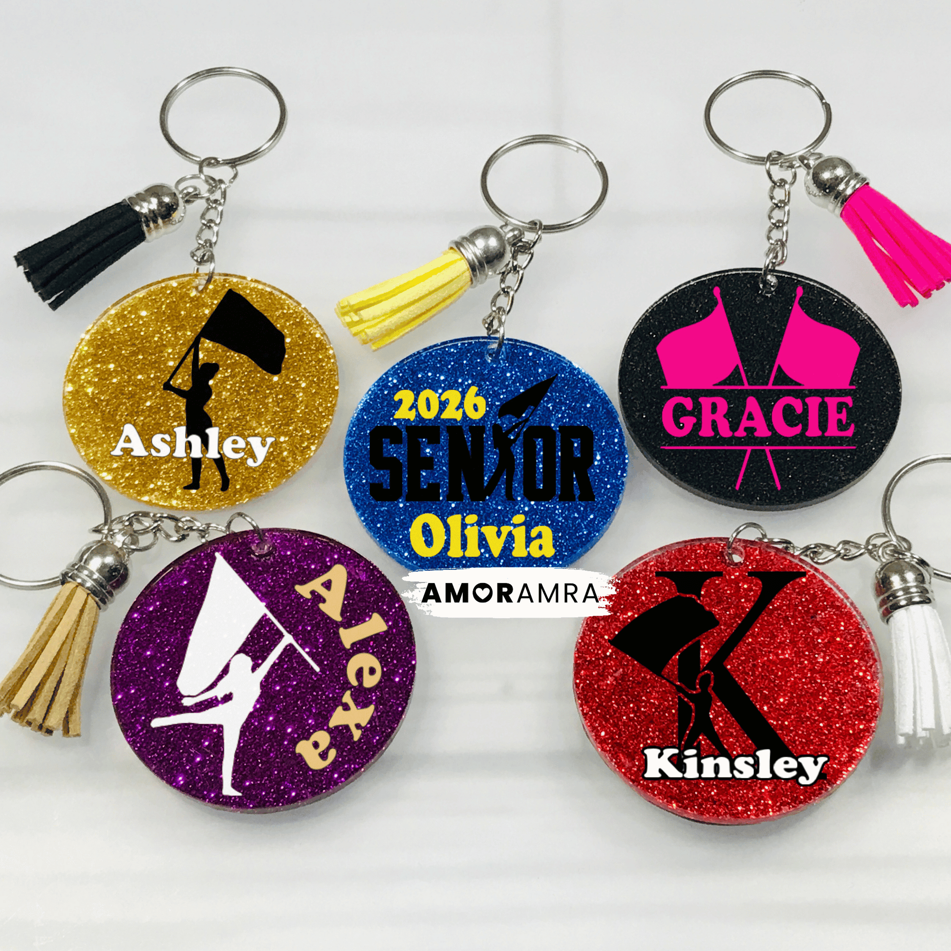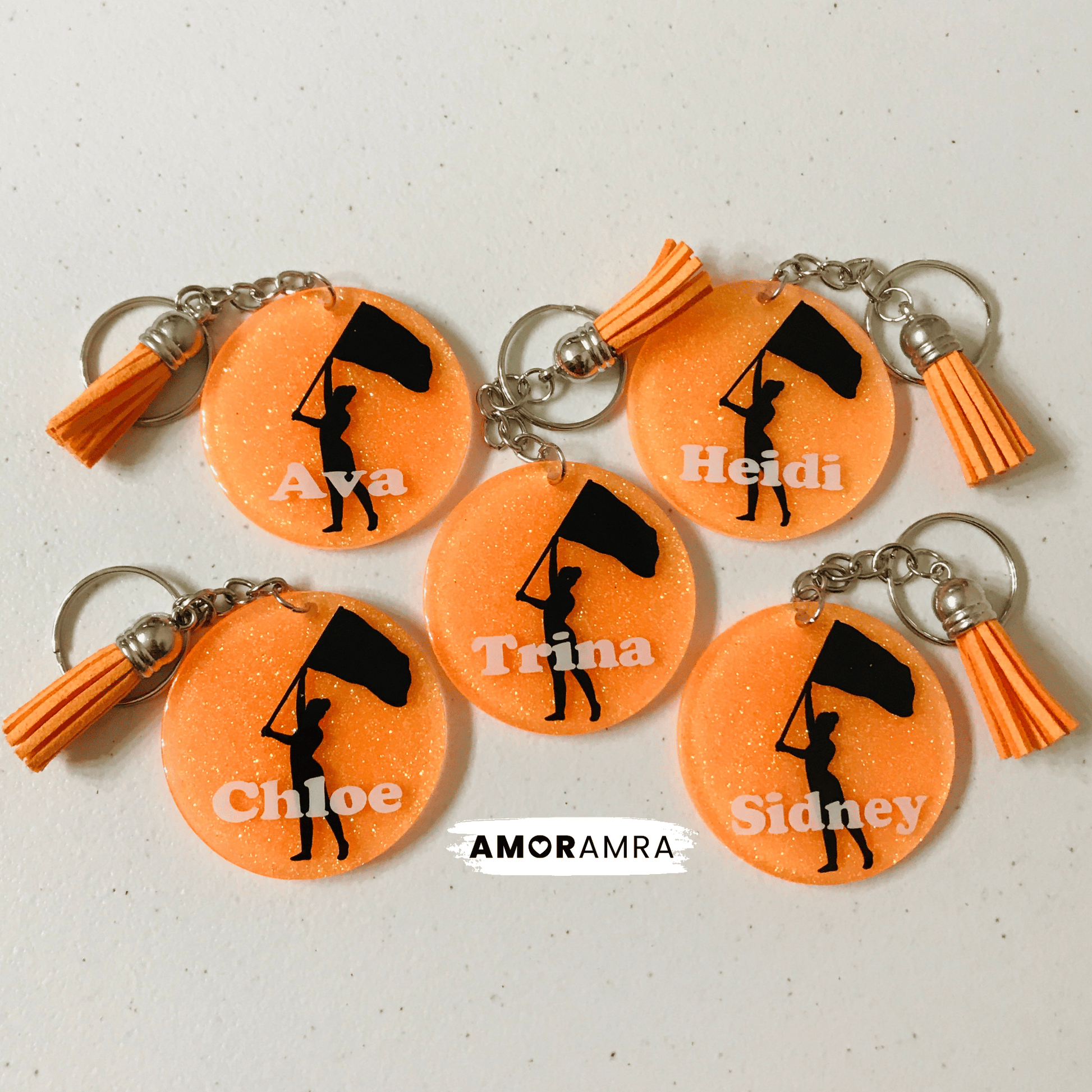 A handmade personalized glitter Color Guard keychain just for you. Perfect for dance gift bags, majorettes, marching band gifts, backpacks, bag tags etc.
