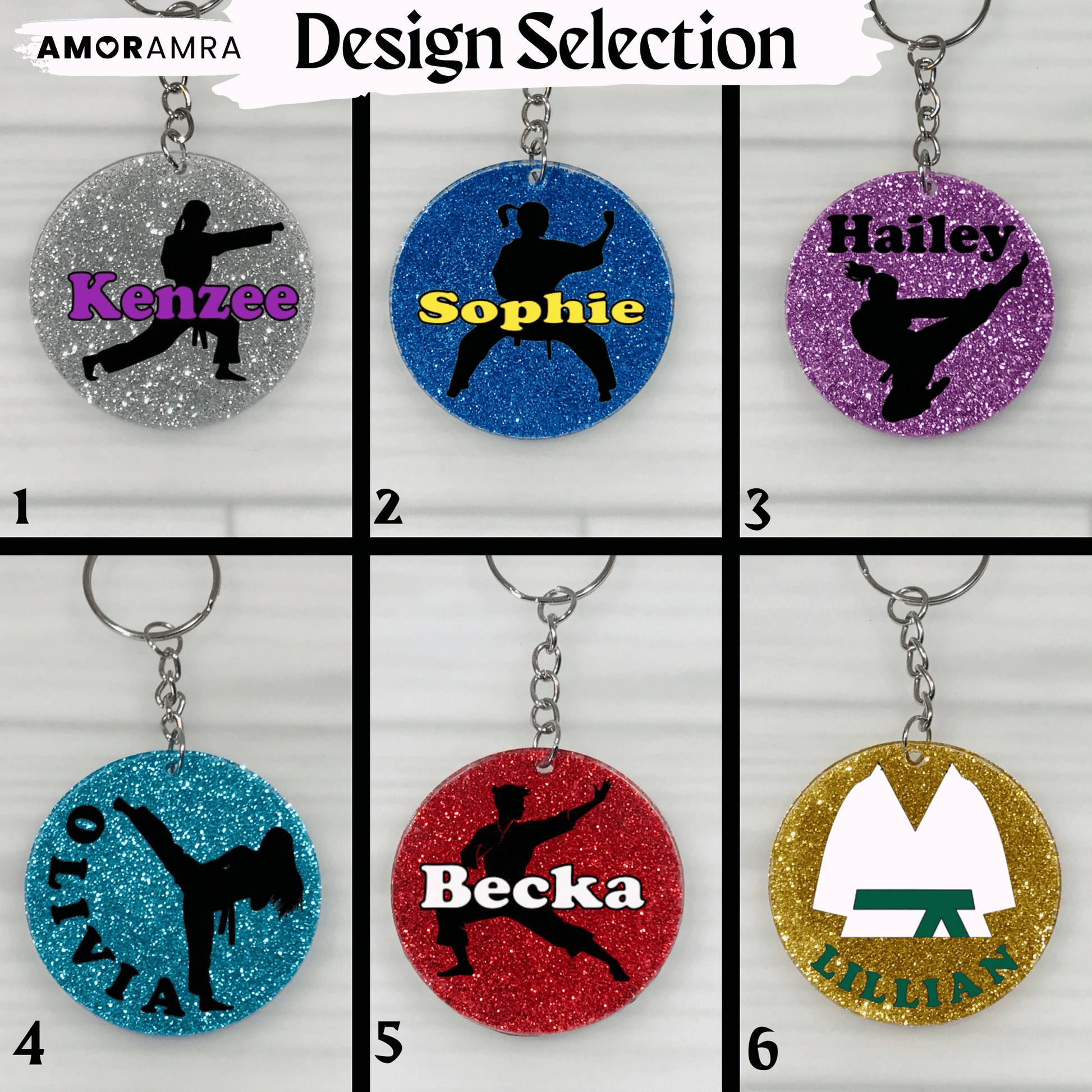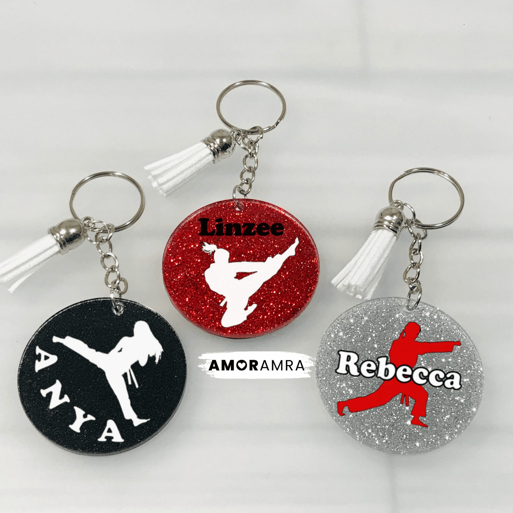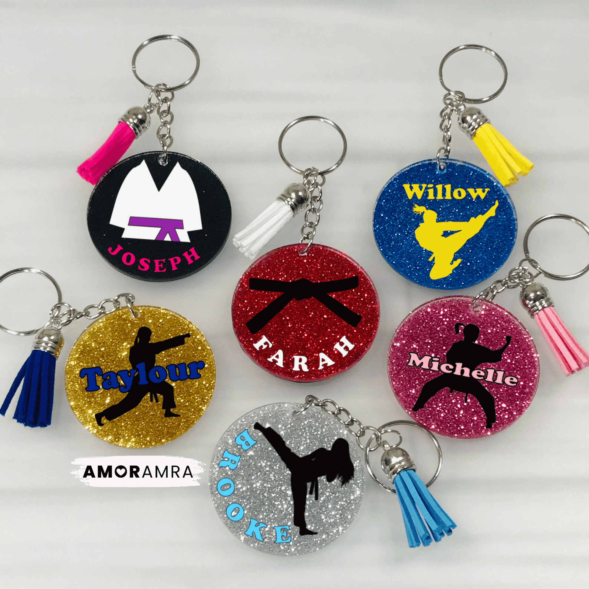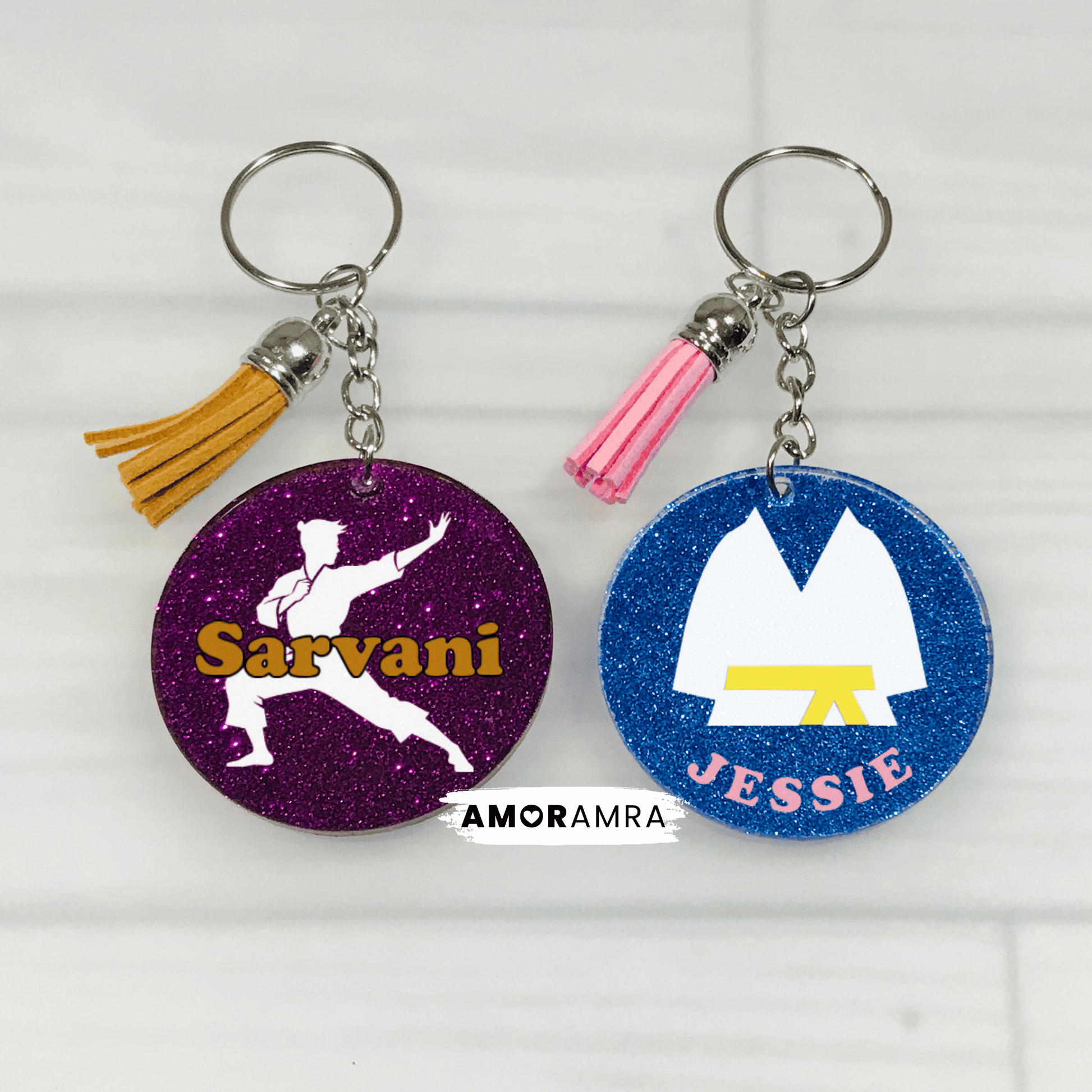 Each keychain comes with a silver ring and leather tassel; sizes include 2" or 2.5".