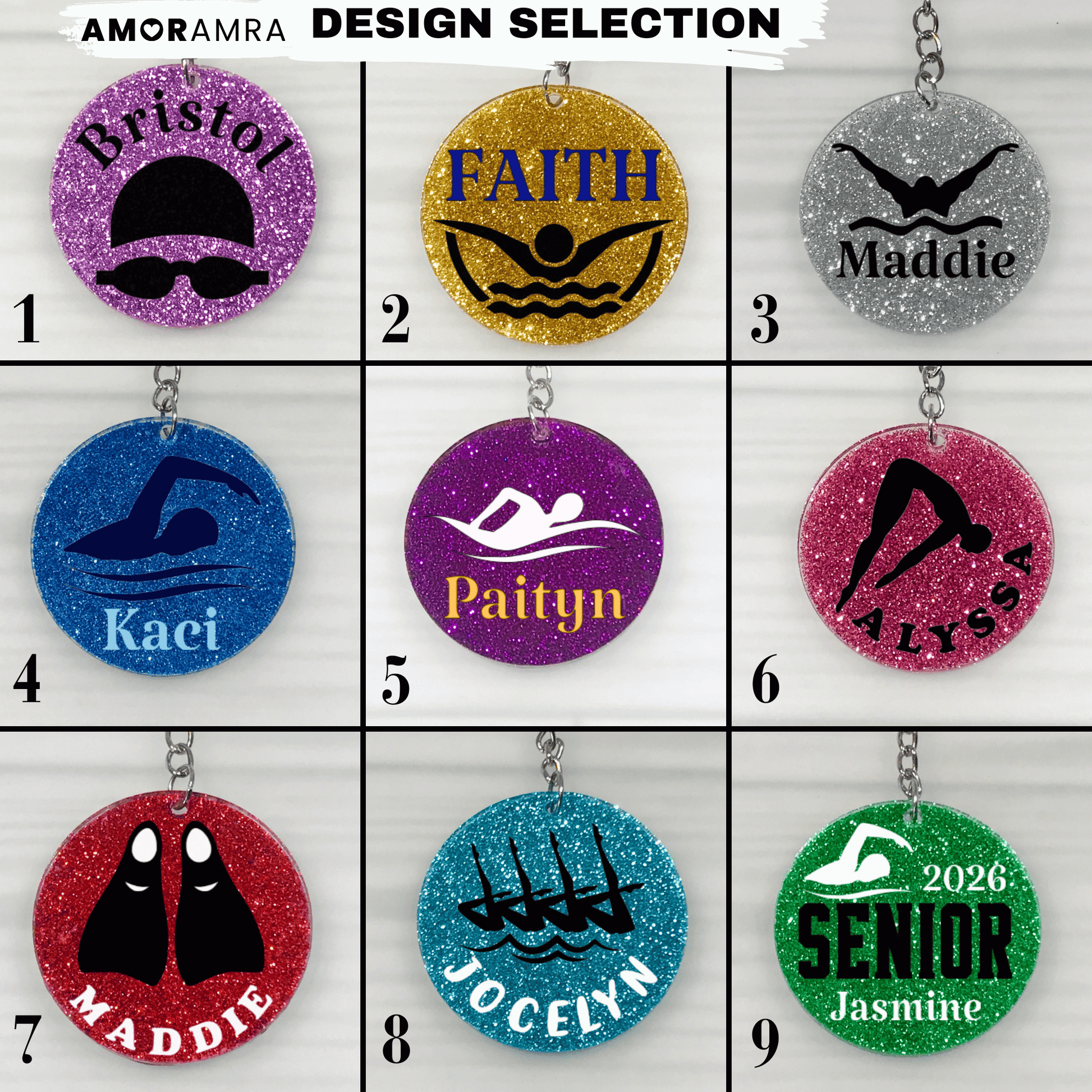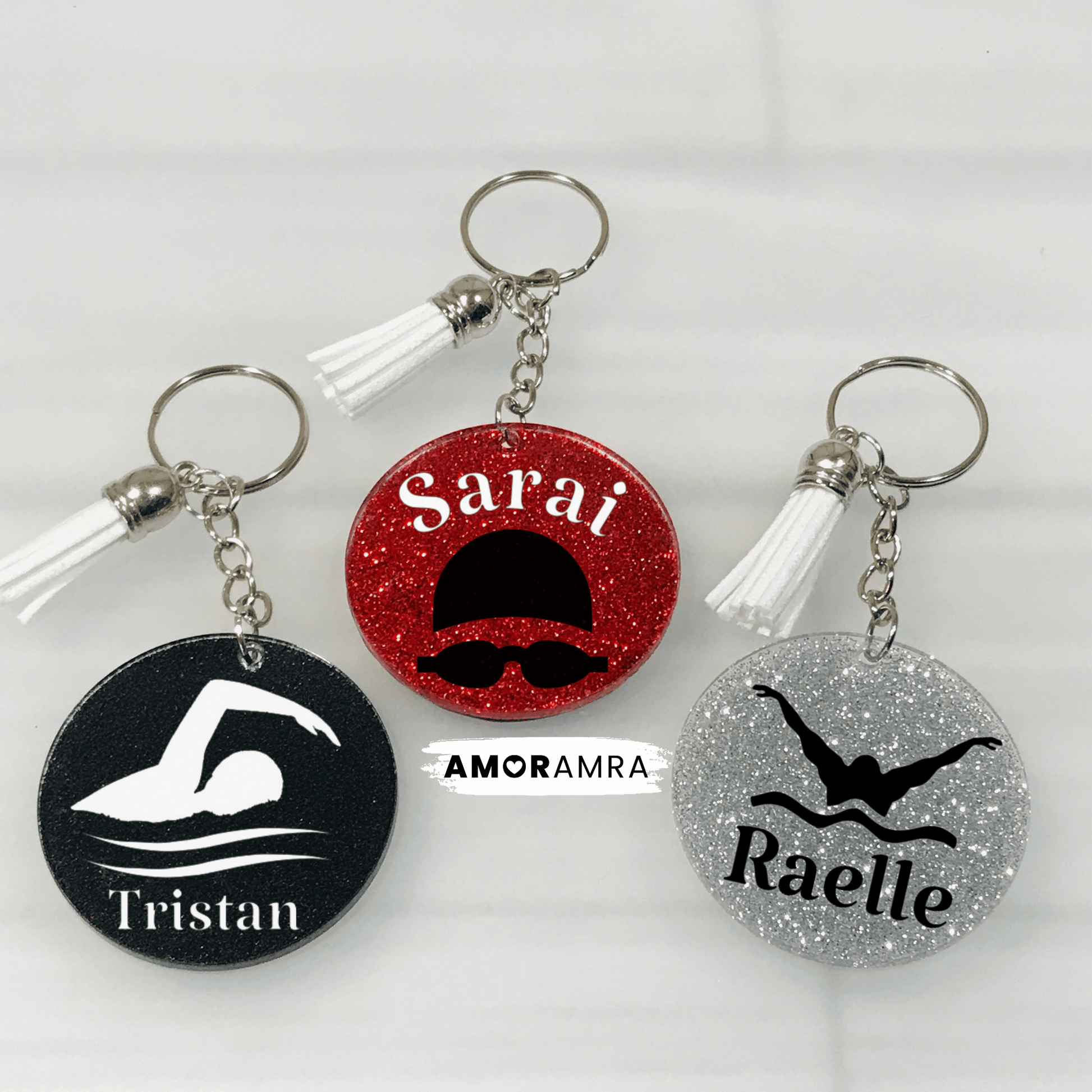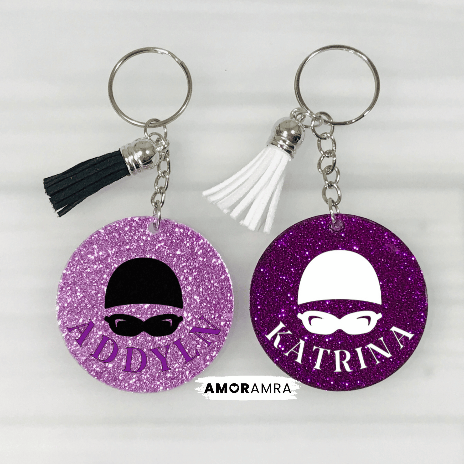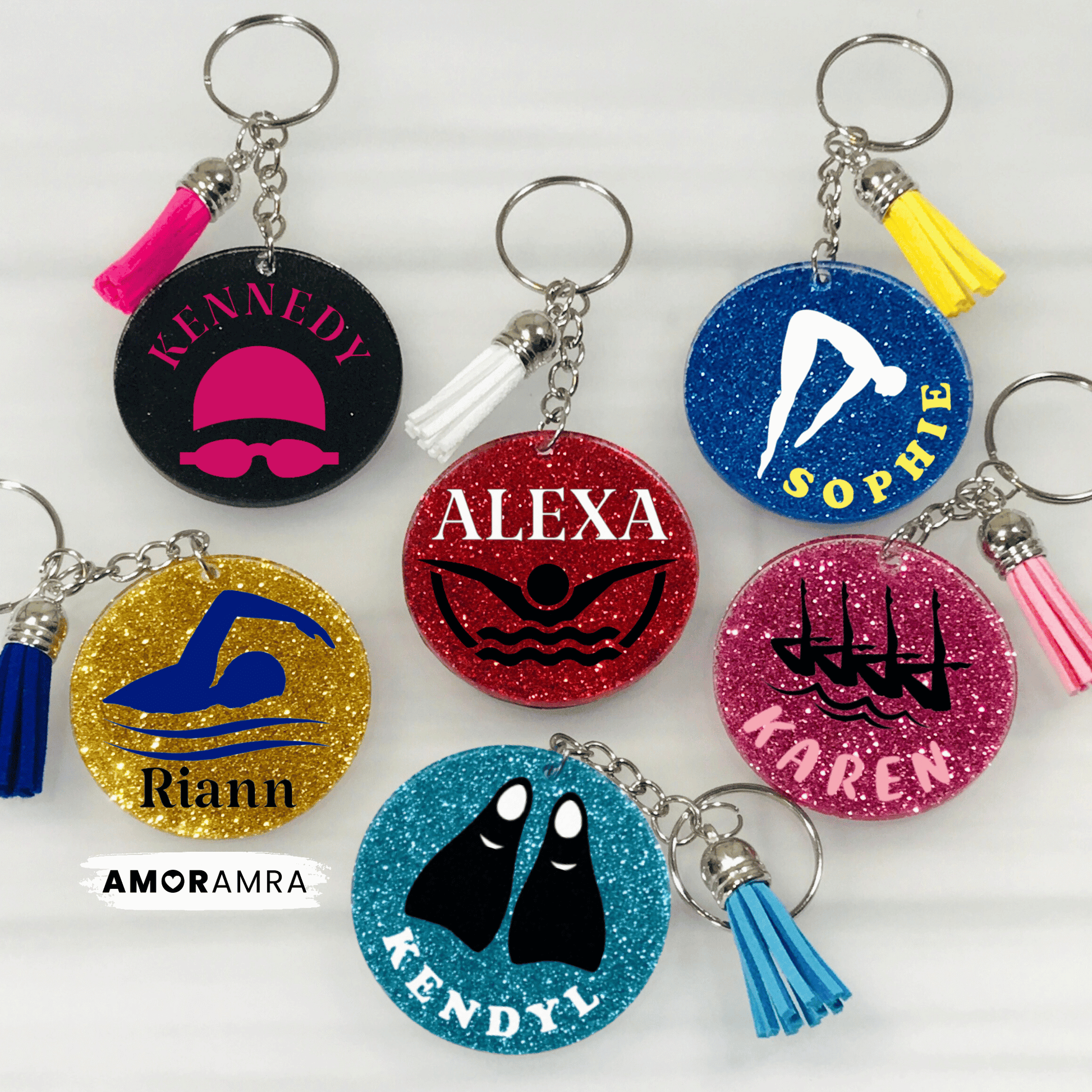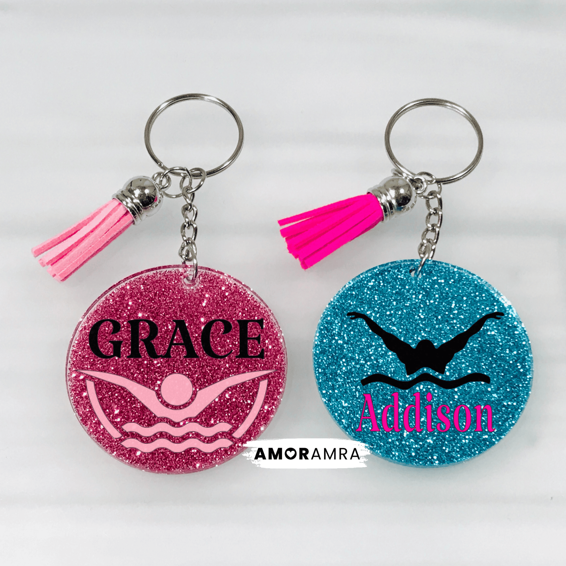 A handmade personalized glitter swimmer keychain just for you. Perfect for swim bags, swim teams etc.