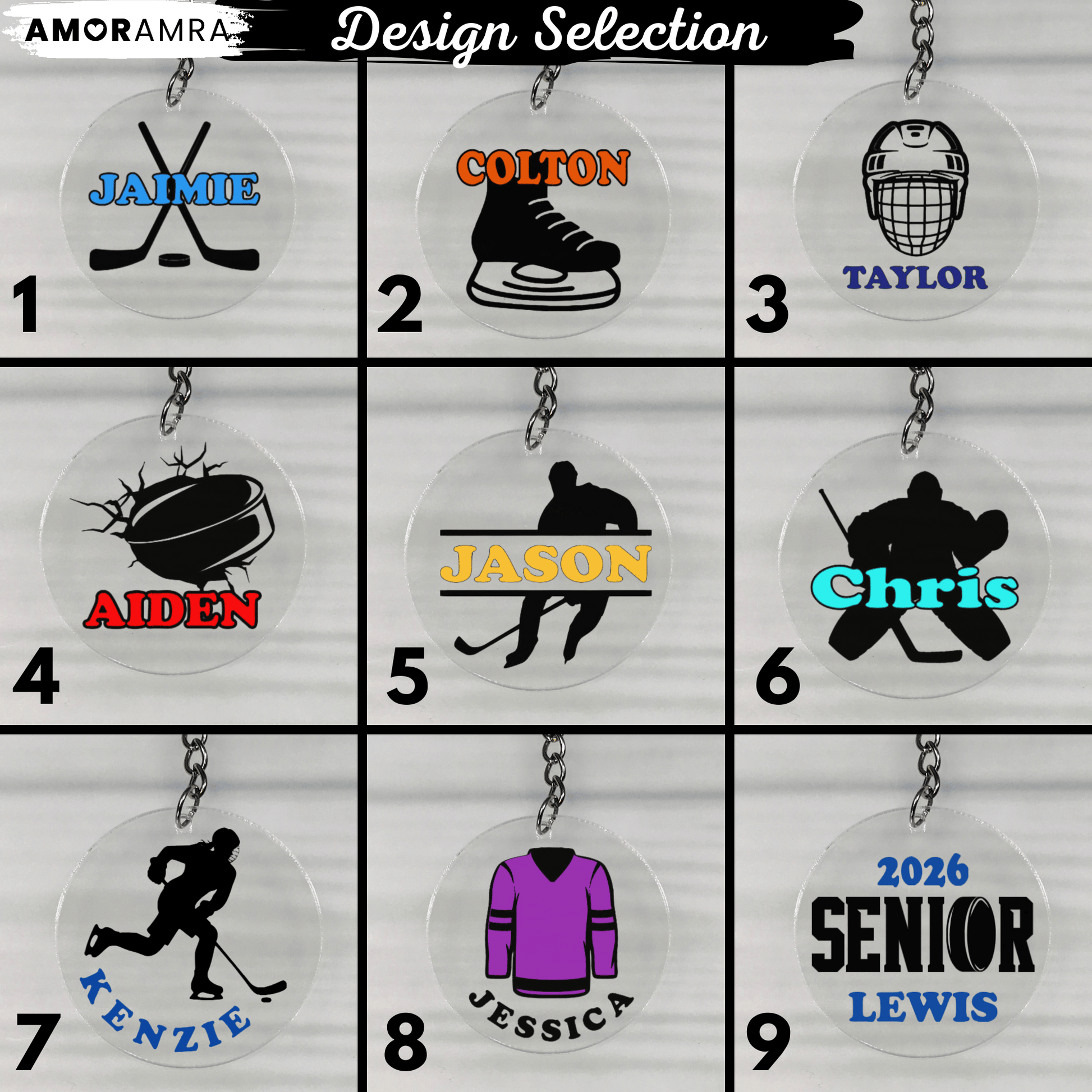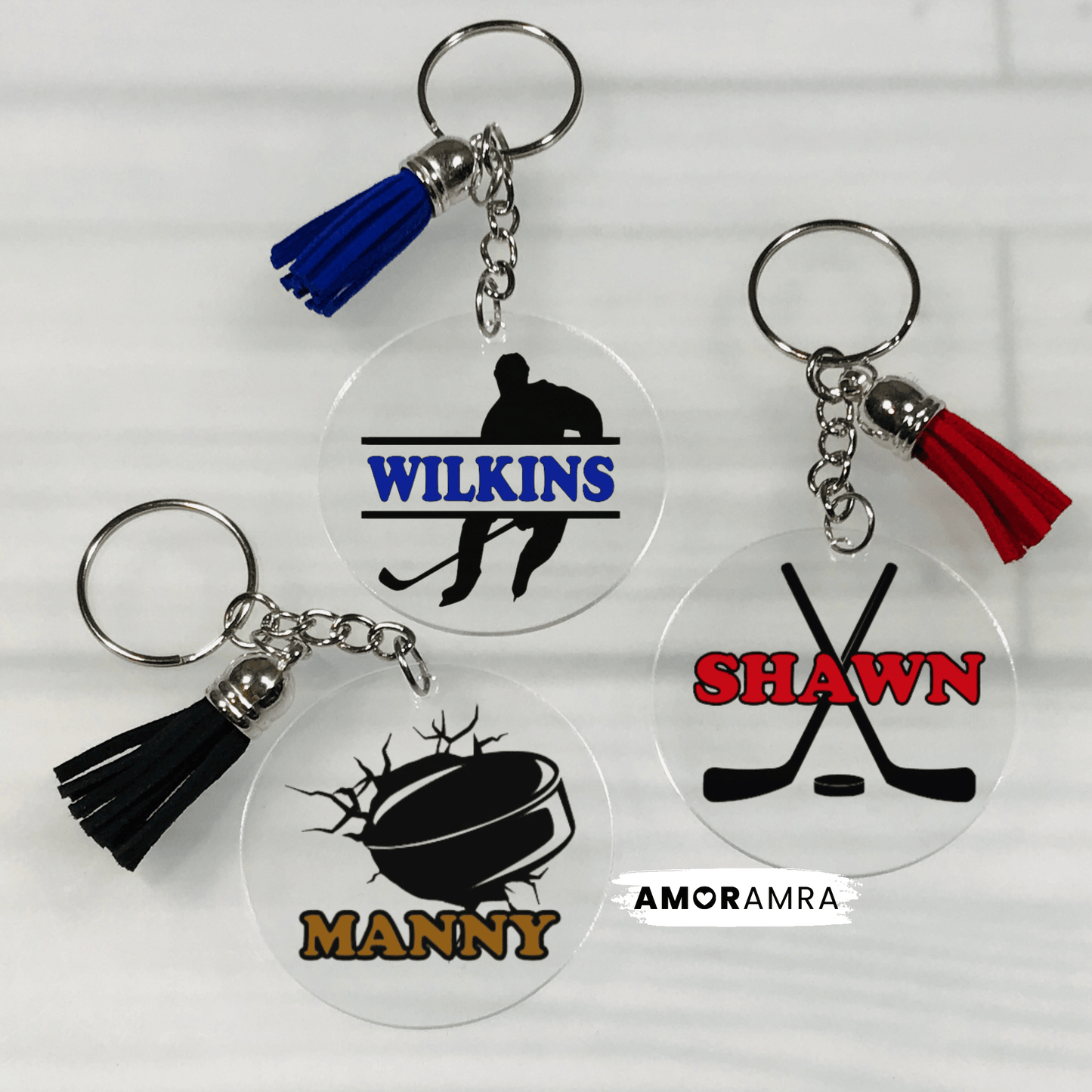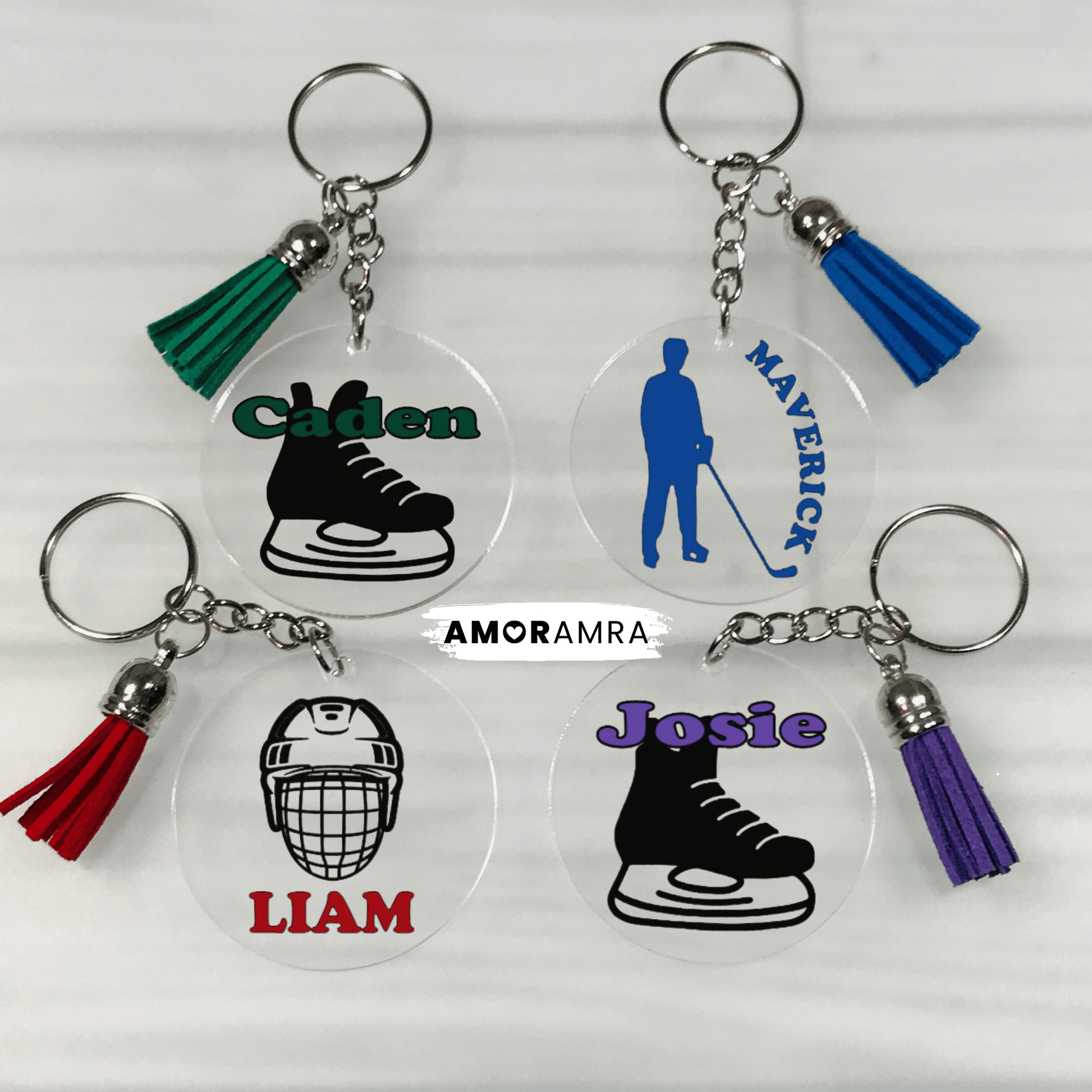 "Show your team spirit with this personalized hockey keychain; perfect bag tags, team gifts or coach gift.