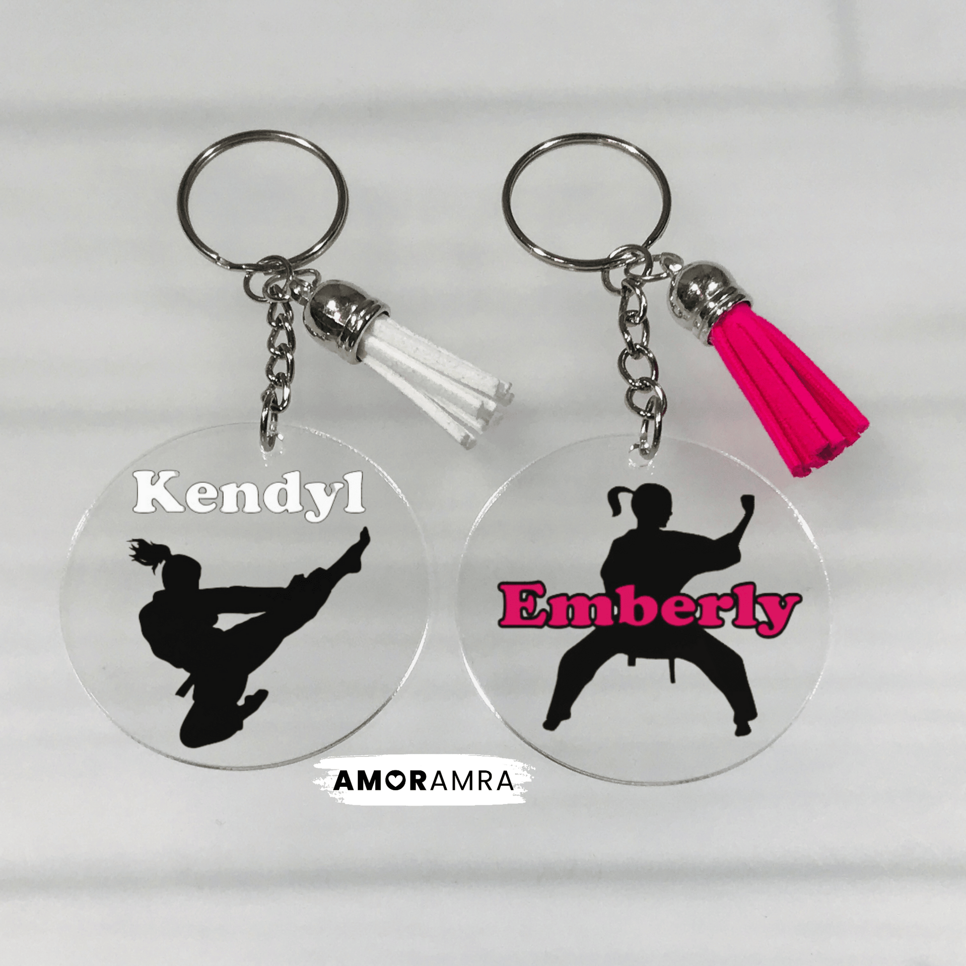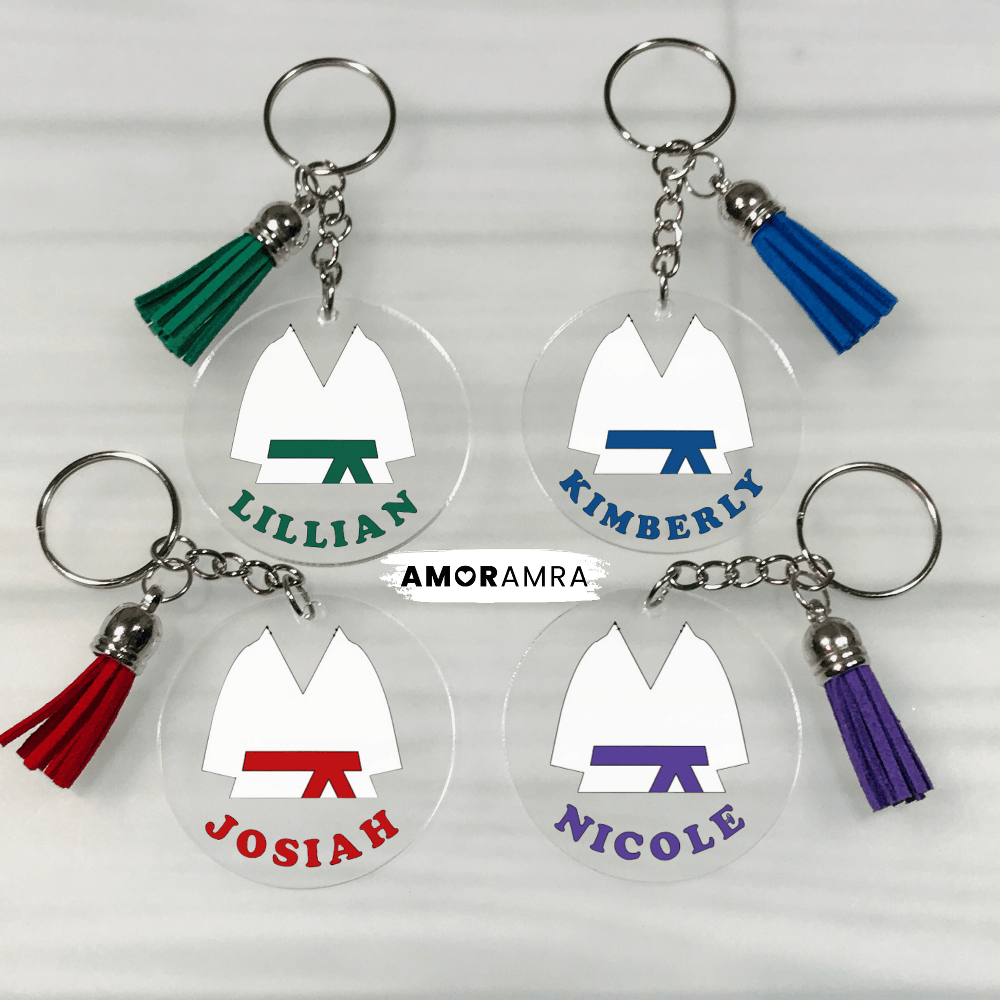 Each keychain comes with a silver ring and leather tassel; sizes include 2" or 2.5".