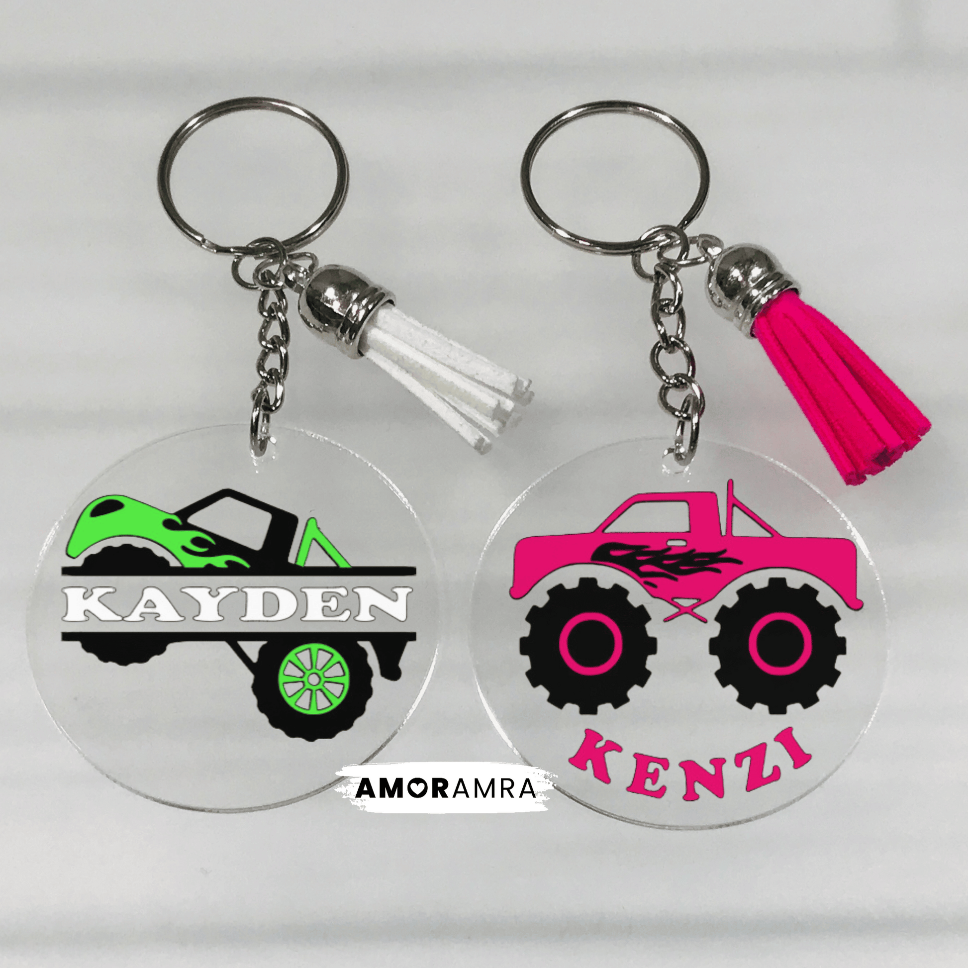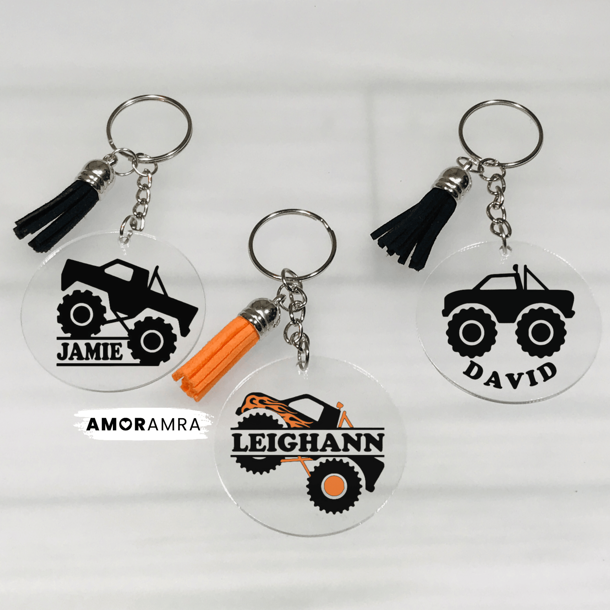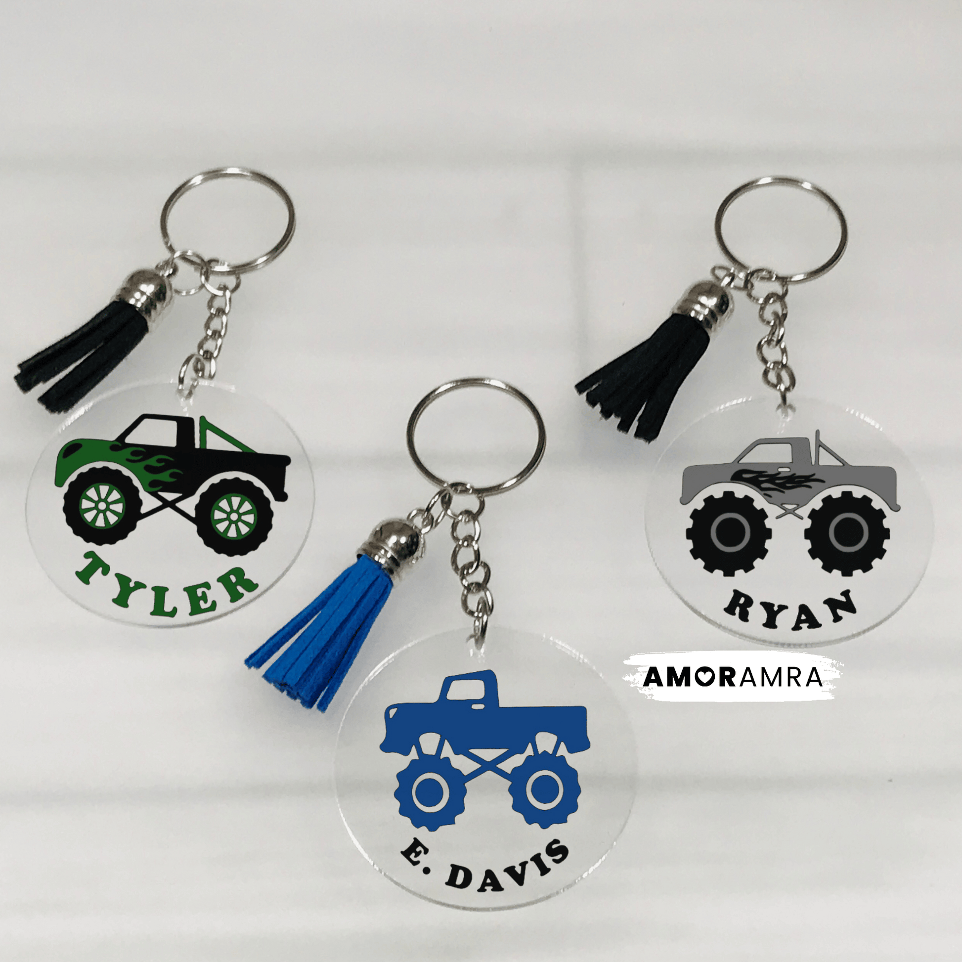 A handmade personalized monster truck keychain just for you. These are perfect for accessorizing & gift-giving: birthday gift, Christmas gift, just because gift, personal gift, or party favors.