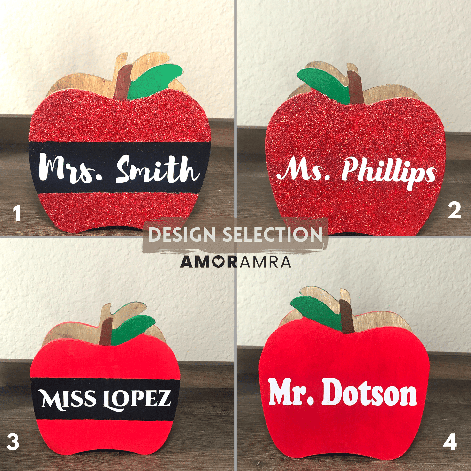 The apple pencil holders are hand stained and painted wood with vinyl names.