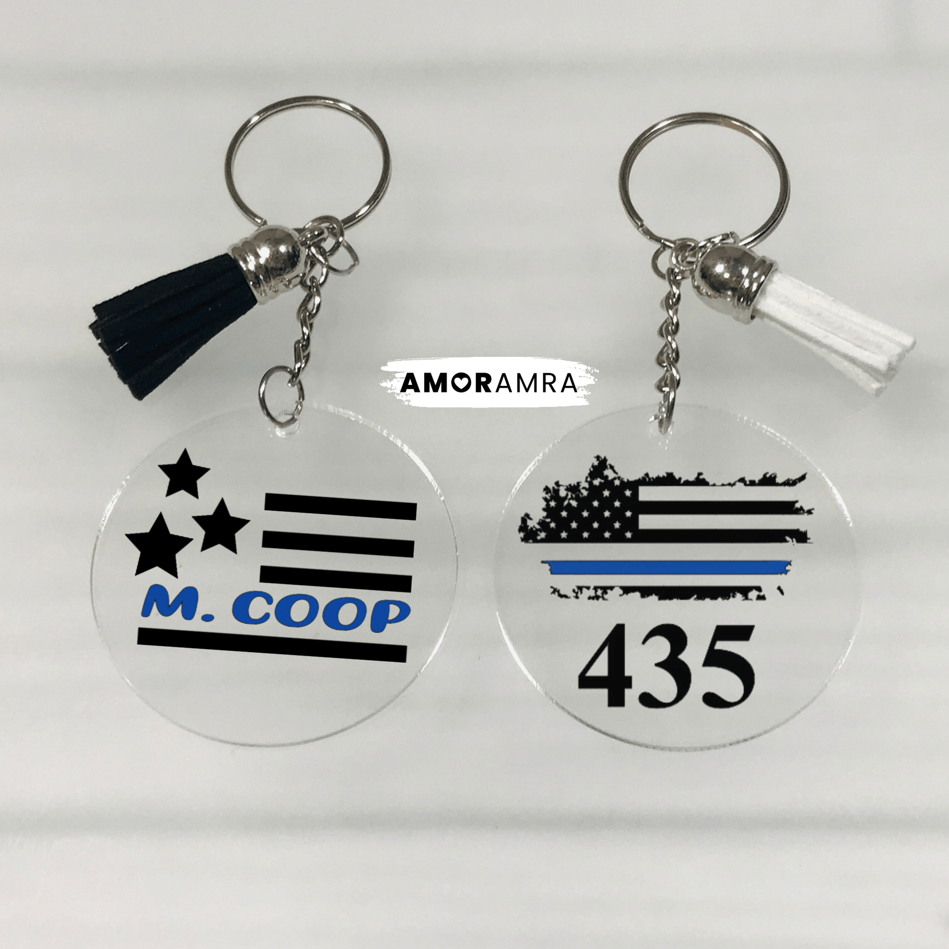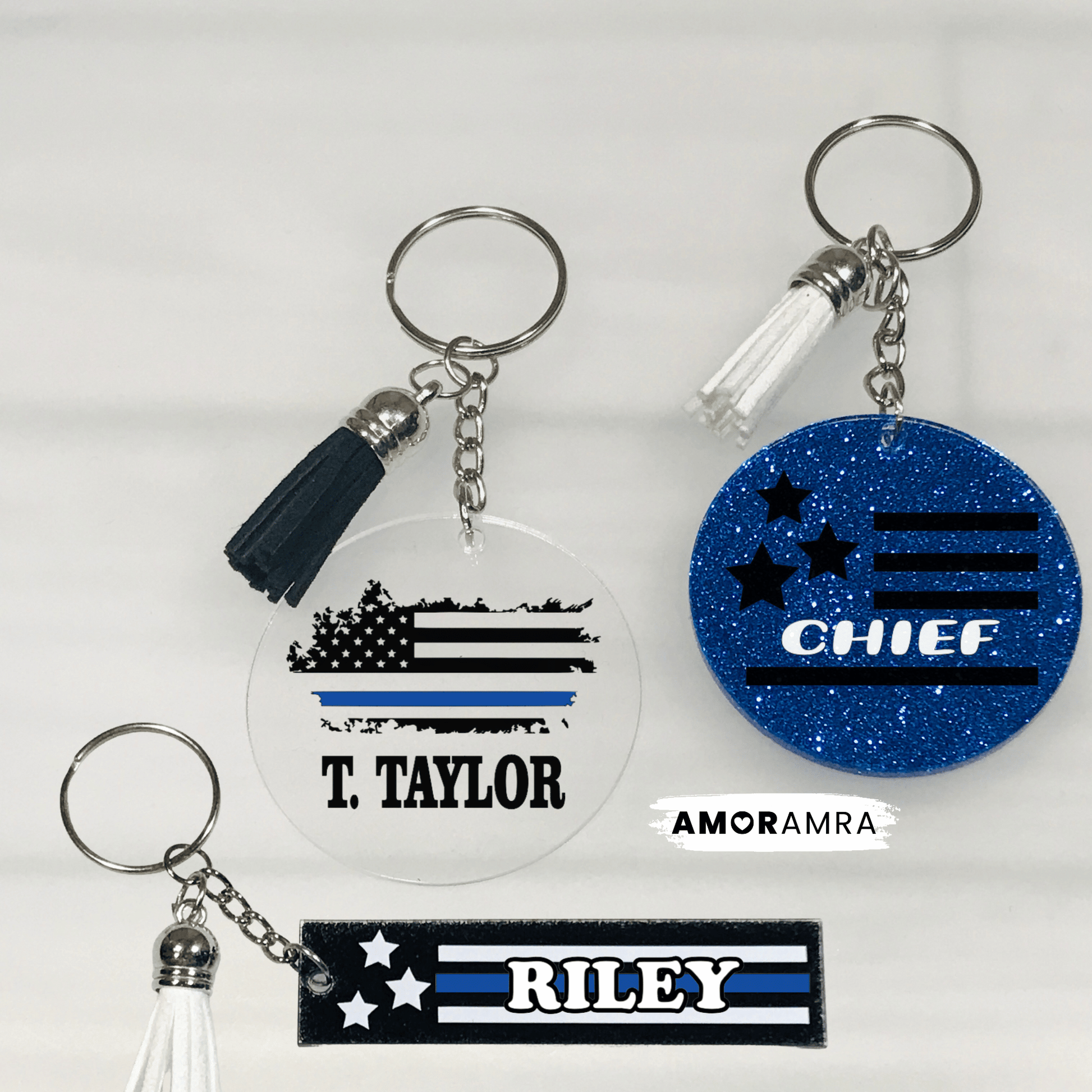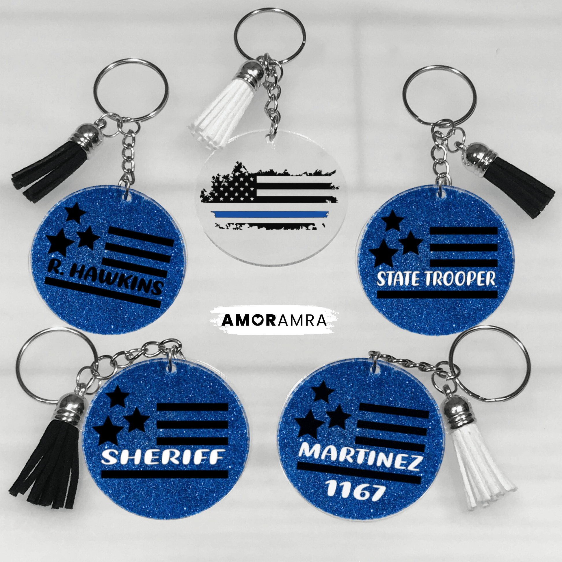 A handmade personalized thin blue line keychain just for you. Perfect gifts for co-workers.