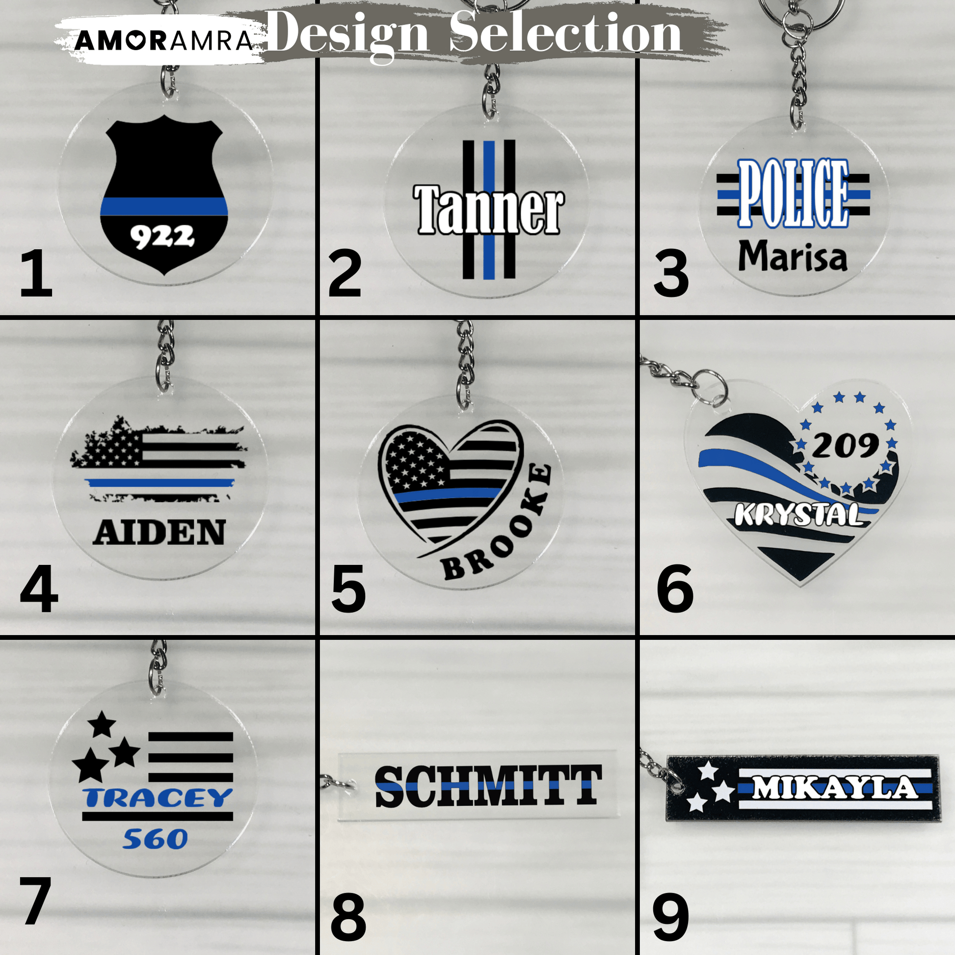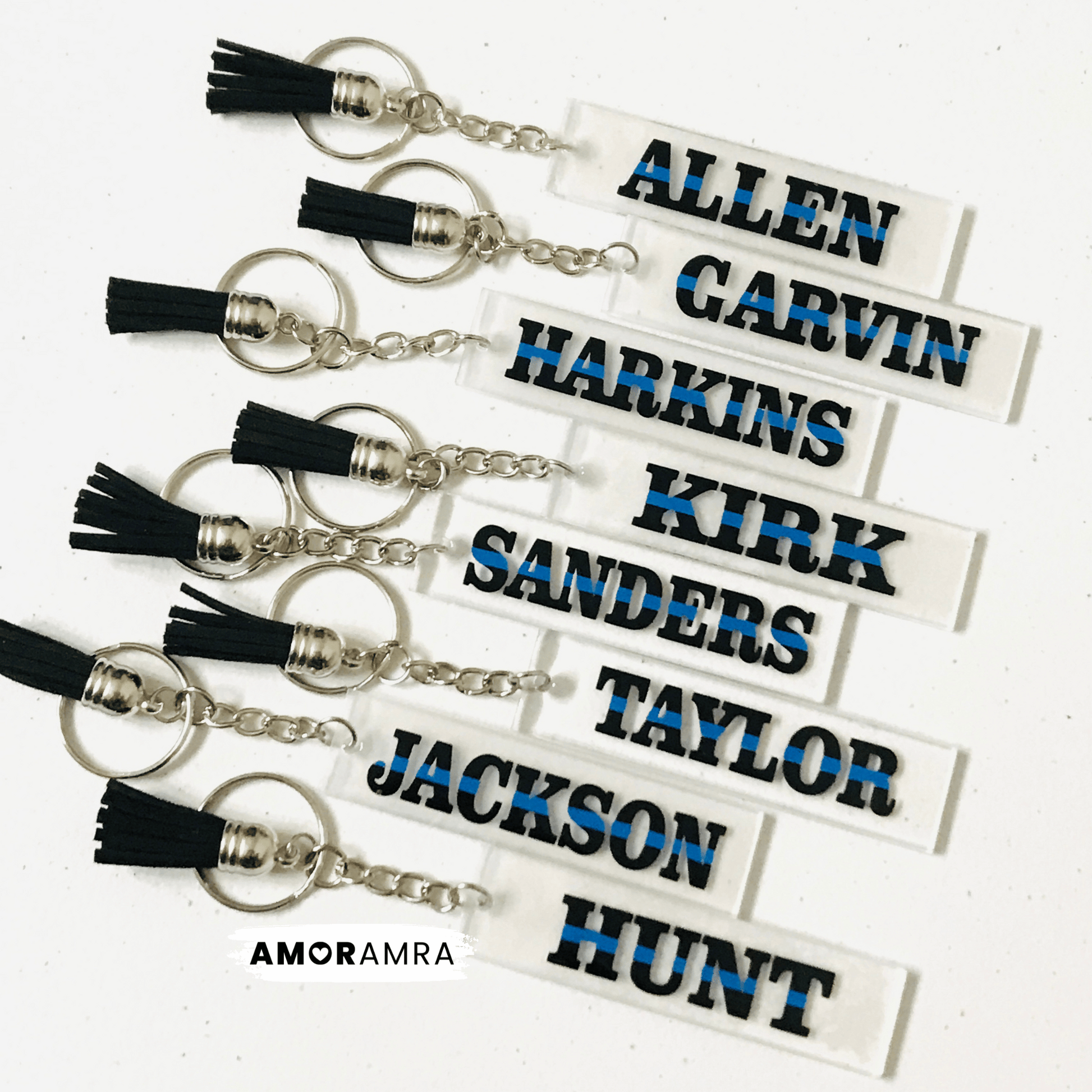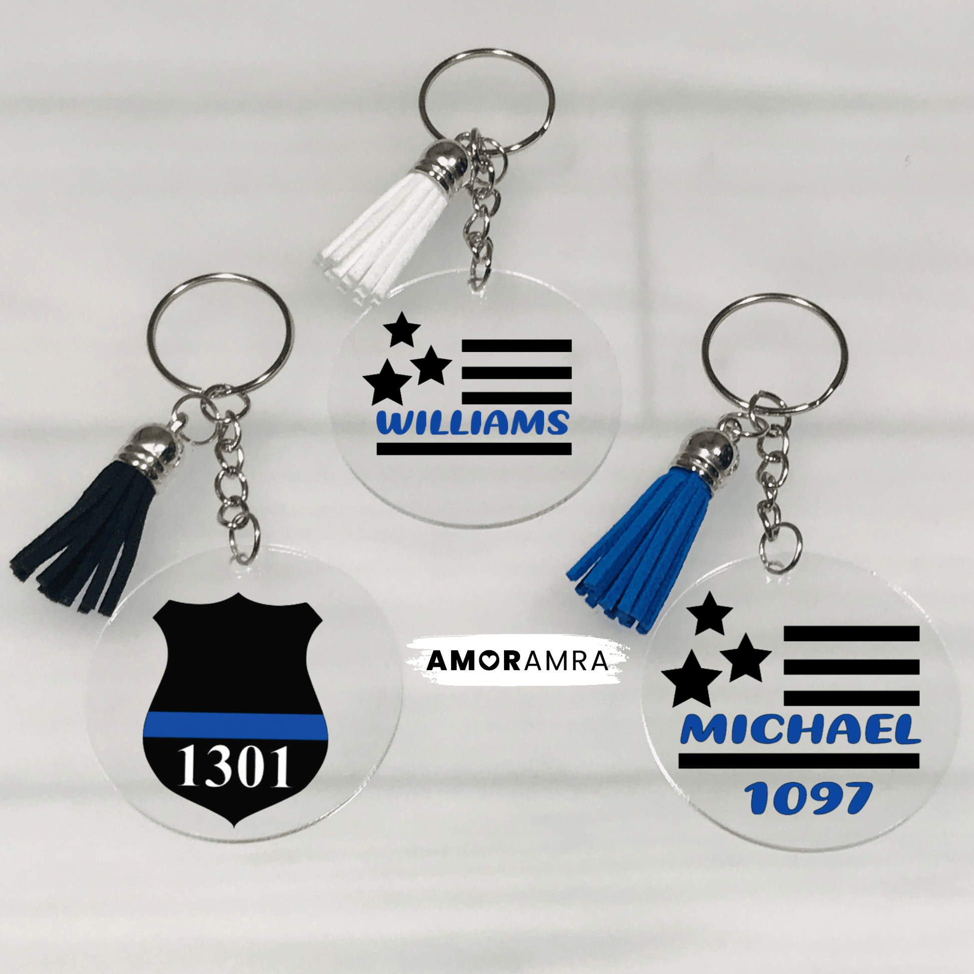 A handmade personalized thin blue line keychain just for you. Perfect gifts for co-workers.