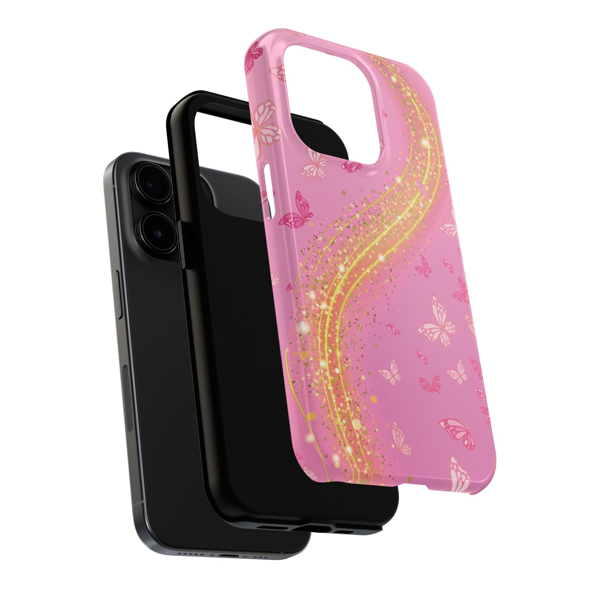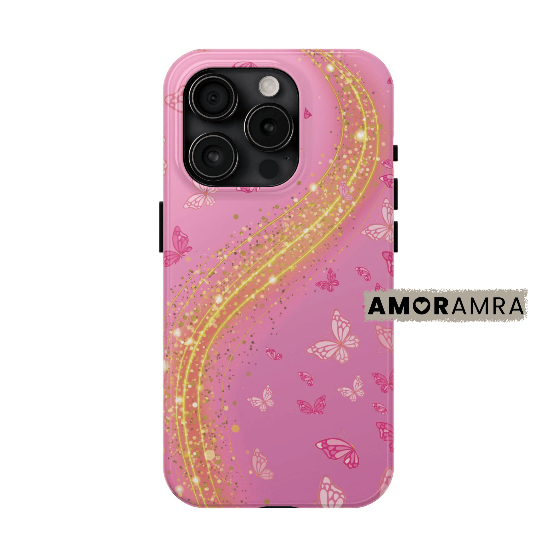 Add a touch of sparkle to your everyday look with this pink butterfly iPhone case featuring golden glitter swirls and delicate fluttering butterflies. The soft pink background brings a feminine and cheerful vibe, while the golden glitter trail adds a magical finish that makes your phone truly stand out. Perfect for butterfly lovers, glitter fans, or anyone drawn to uplifting, joyful designs.