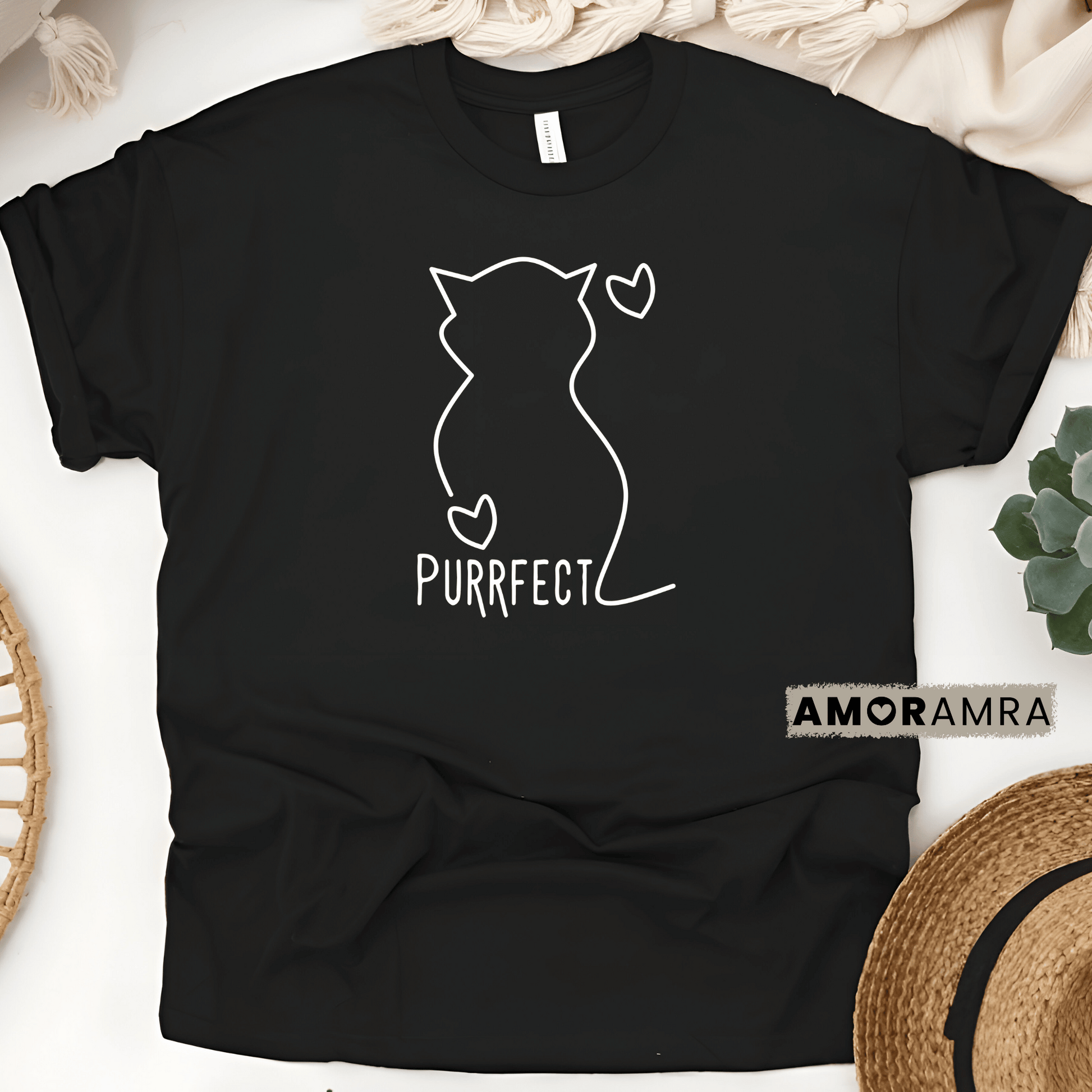 The 'Purrfect' cat t-shirt is perfect for any cat lover, cat mom, or cat dad. Featuring a sleek minimalist cat design with playful heart accents, this is a must-have if you're looking for a funny cat lover gift, a cat mom top, or a minimalist animal lover shirt.
