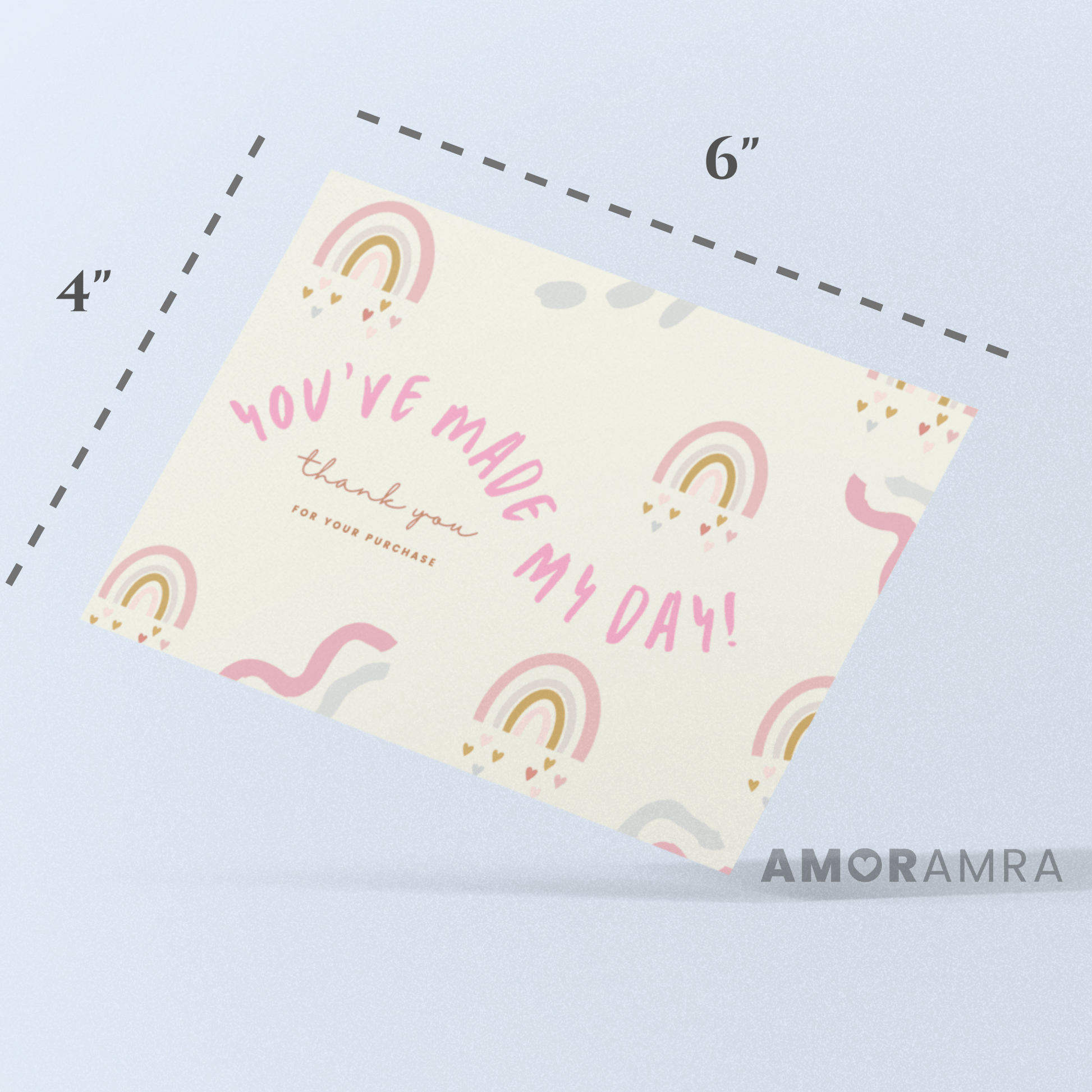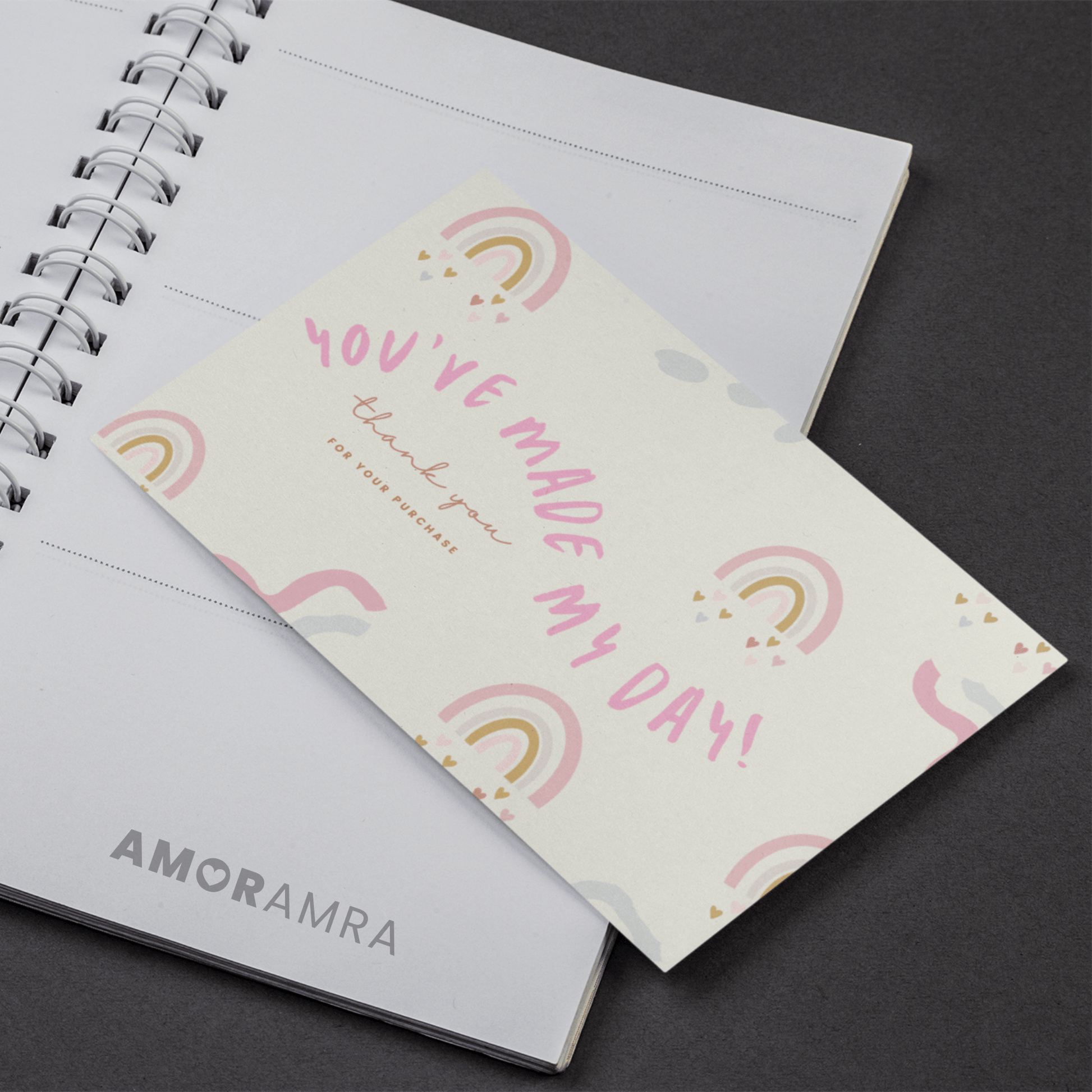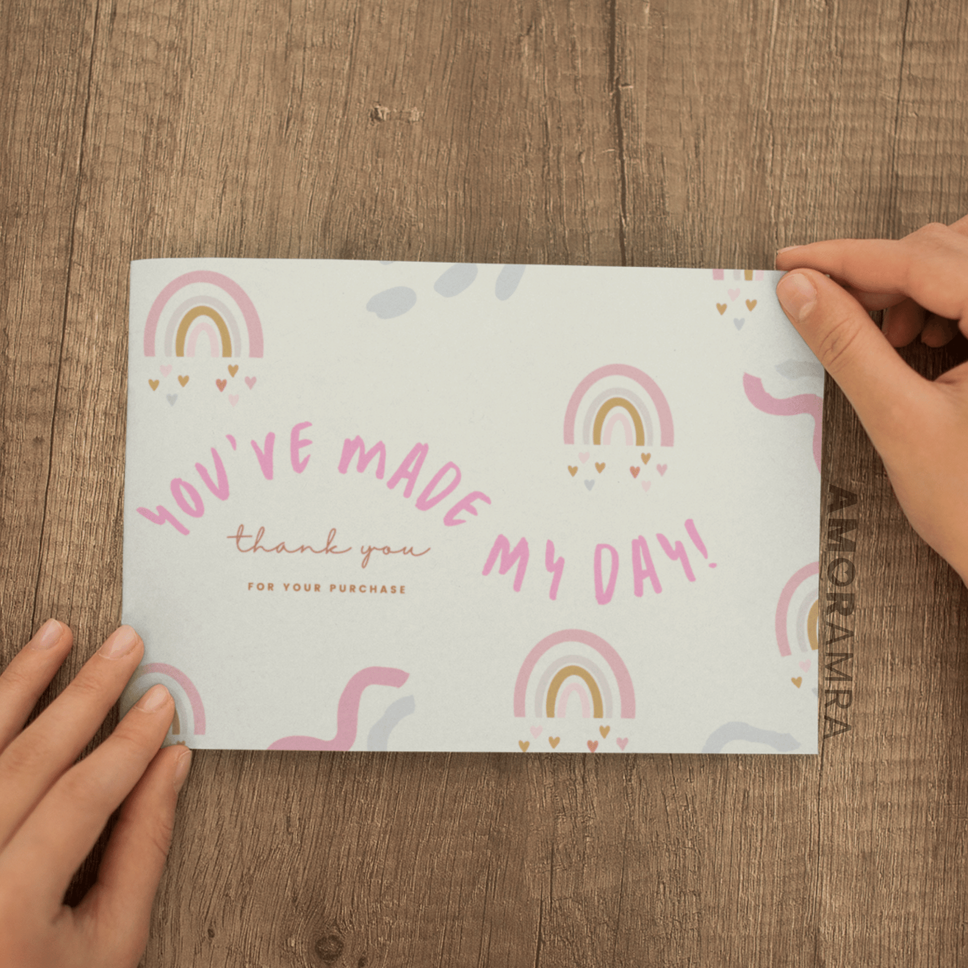 Thank You cards are a perfect addition when packaging orders for your business. Show your customer appreciation with this rainbow "You've made my day" Thank You card design.