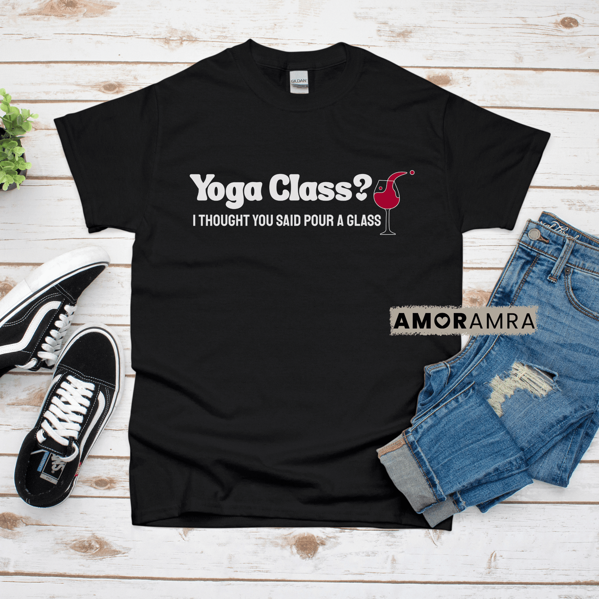 The 'Yoga Class? I Thought You Said Pour a Glass' t-shirt is perfect for wine lovers and yogis. This shirt makes a perfect gift for yoga lovers, wine enthusiasts, and anyone who enjoys a little humor with their self-care routine. Whether you're stretching it out on the mat or pouring a glass of your favorite red or white, this funny yoga tee will keep you feeling relaxed and stylish. Perfect for girls' night, yoga class, or just lounging at home.